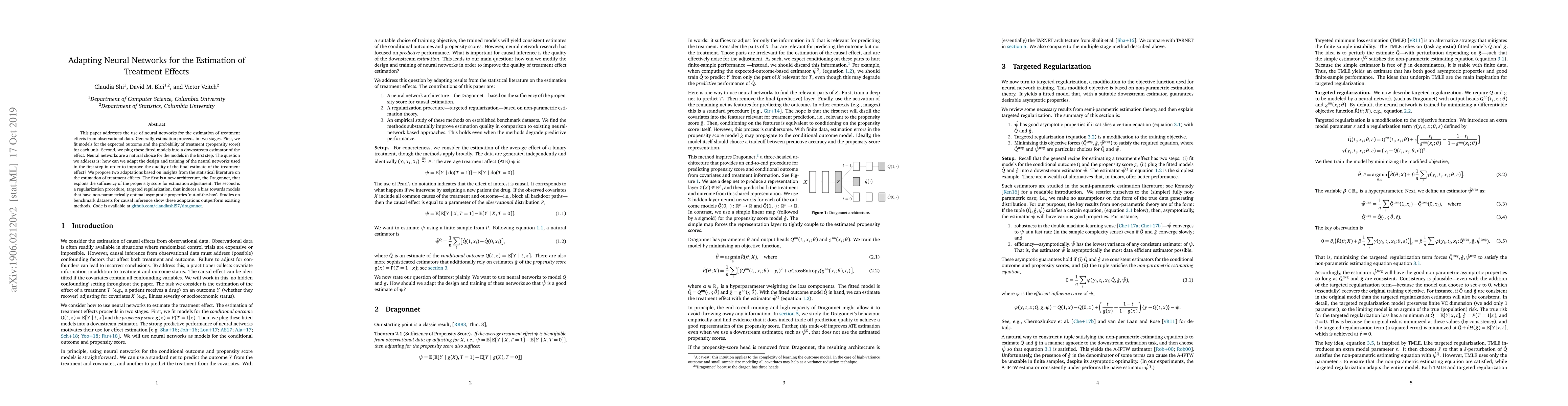 This paper addresses the use of neural networks for the estimation of treatment effects from observational data. Generally, estimation proceeds in two stages. First, we fit models for the expected outcome and the probability of treatment (propensity score) for each unit. Second, we plug these fitted models into a downstream estimator of the effect. Neural networks are a natural choice for the models in the first step. The question we address is: how can we adapt the design and training of the neural networks used in the first step in order to improve the quality of the final estimate of the treatment effect? We propose two adaptations based on insights from the statistical literature on the estimation of treatment effects. The first is a new architecture, the Dragonnet, that exploits the sufficiency of the propensity score for estimation adjustment. The second is a regularization procedure, targeted regularization, that induces a bias towards models that have non-parametrically optimal asymptotic properties `out-of-the-box`. Studies on benchmark datasets for causal inference show these adaptations outperform existing methods. Code is available at github.com/claudiashi57/dragonnet.
