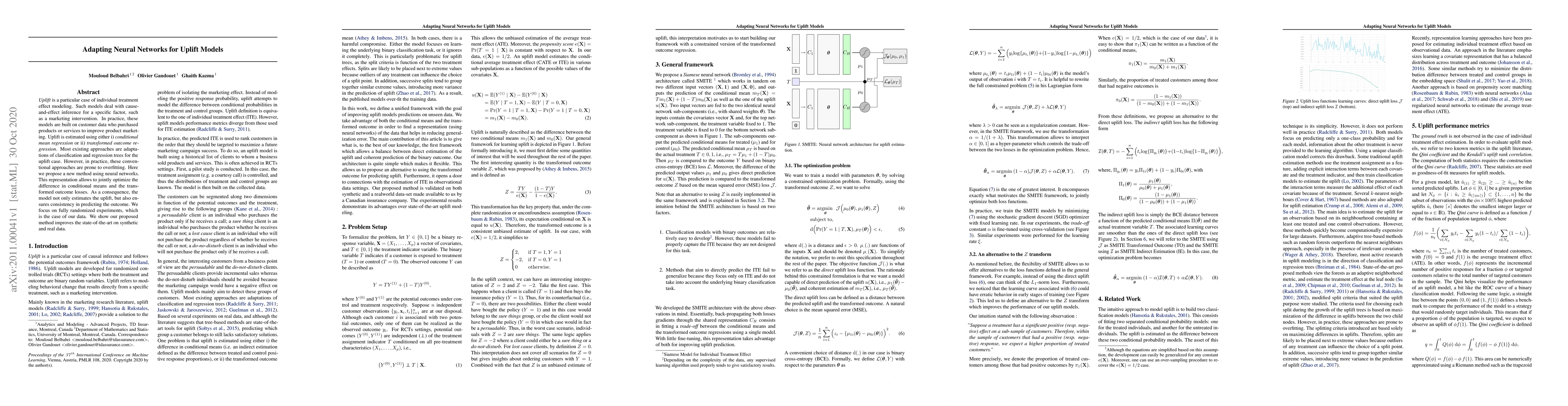 Uplift is a particular case of individual treatment effect modeling. Such models deal with cause-and-effect inference for a specific factor, such as a marketing intervention. In practice, these models are built on customer data who purchased products or services to improve product marketing. Uplift is estimated using either i) conditional mean regression or ii) transformed outcome regression. Most existing approaches are adaptations of classification and regression trees for the uplift case. However, in practice, these conventional approaches are prone to overfitting. Here we propose a new method using neural networks. This representation allows to jointly optimize the difference in conditional means and the transformed outcome losses. As a consequence, the model not only estimates the uplift, but also ensures consistency in predicting the outcome. We focus on fully randomized experiments, which is the case of our data. We show our proposed method improves the state-of-the-art on synthetic and real data.