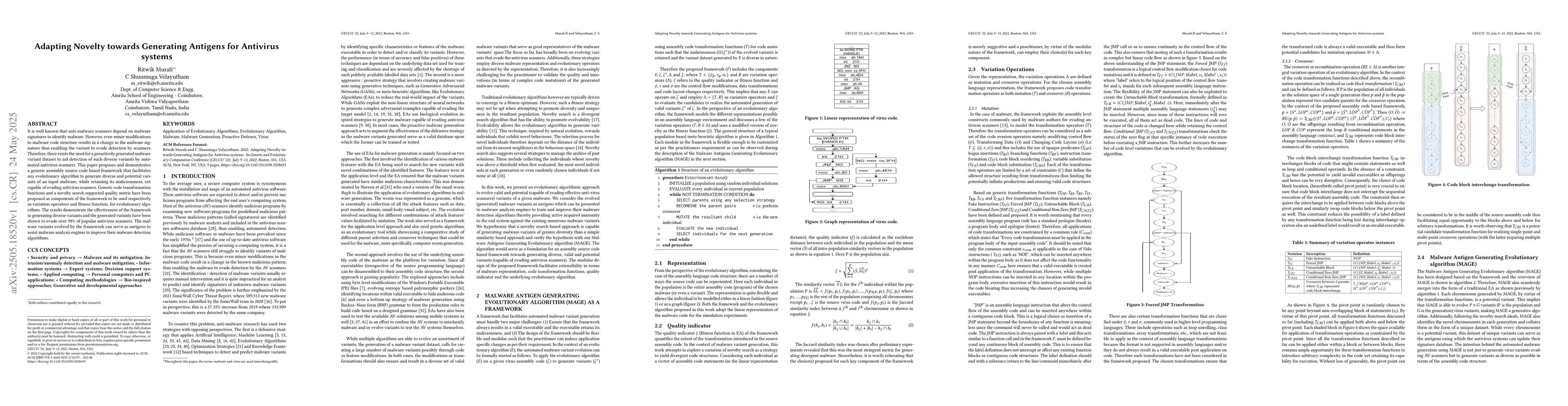 The paper proposes a framework utilizing evolutionary algorithms with generic code transformation functions and novelty search-supported quality metrics to generate diverse malware variants from an input malware sample.