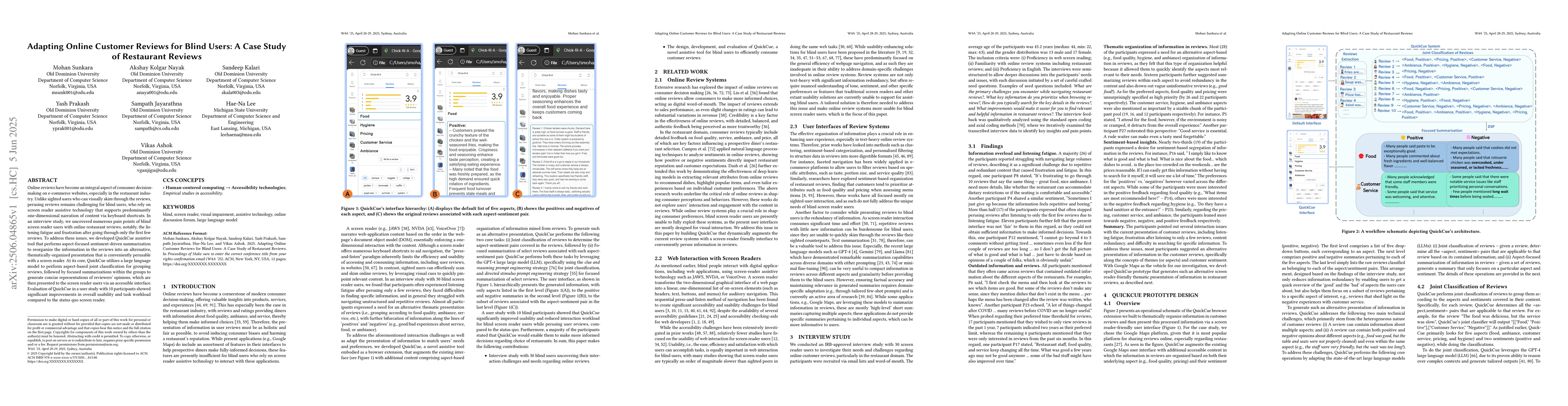 An interview study and user experiment were conducted to identify pain points and evaluate the QuickQue assistive tool for blind users navigating restaurant reviews.