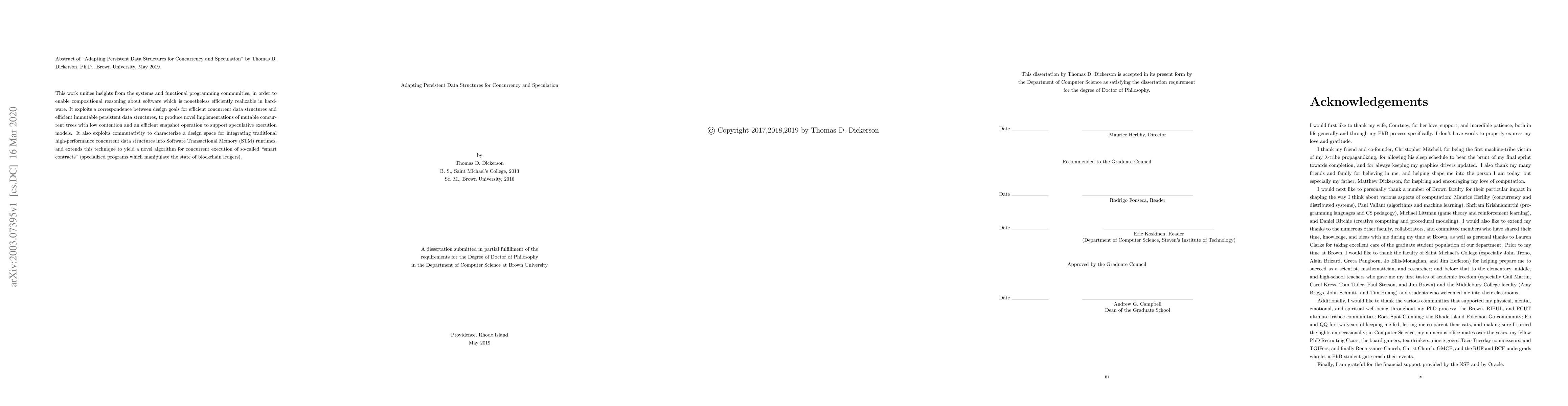 This work unifies insights from the systems and functional programming communities, in order to enable compositional reasoning about software which is nonetheless efficiently realizable in hardware. It exploits a correspondence between design goals for efficient concurrent data structures and efficient immutable persistent data structures, to produce novel implementations of mutable concurrent trees with low contention and an efficient snapshot operation to support speculative execution models. It also exploits commutativity to characterize a design space for integrating traditional high-performance concurrent data structures into Software Transactional Memory (STM) runtimes, and extends this technique to yield a novel algorithm for concurrent execution of so-called ``smart contracts'' (specialized programs which manipulate the state of blockchain ledgers).