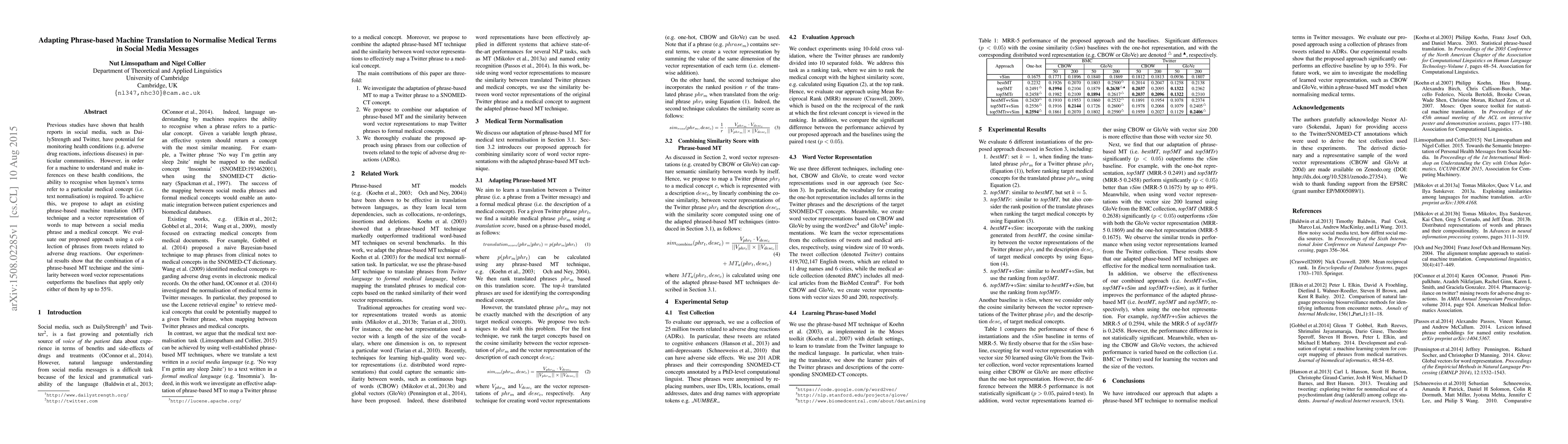 Previous studies have shown that health reports in social media, such as DailyStrength and Twitter, have potential for monitoring health conditions (e.g. adverse drug reactions, infectious diseases) in particular communities. However, in order for a machine to understand and make inferences on these health conditions, the ability to recognise when laymen's terms refer to a particular medical concept (i.e.\ text normalisation) is required. To achieve this, we propose to adapt an existing phrase-based machine translation (MT) technique and a vector representation of words to map between a social media phrase and a medical concept. We evaluate our proposed approach using a collection of phrases from tweets related to adverse drug reactions. Our experimental results show that the combination of a phrase-based MT technique and the similarity between word vector representations outperforms the baselines that apply only either of them by up to 55%.