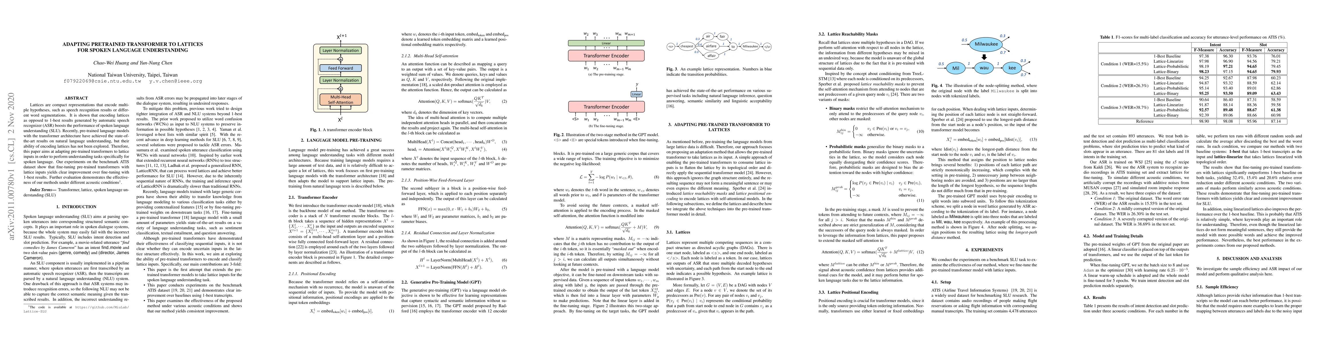 This paper explores adapting pretrained transformer models to encode lattices for spoken language understanding, showing that lattice inputs improve performance over 1-best results. Experiments on the ATIS dataset demonstrate significant gains, and the method is effective under various acoustic conditions.