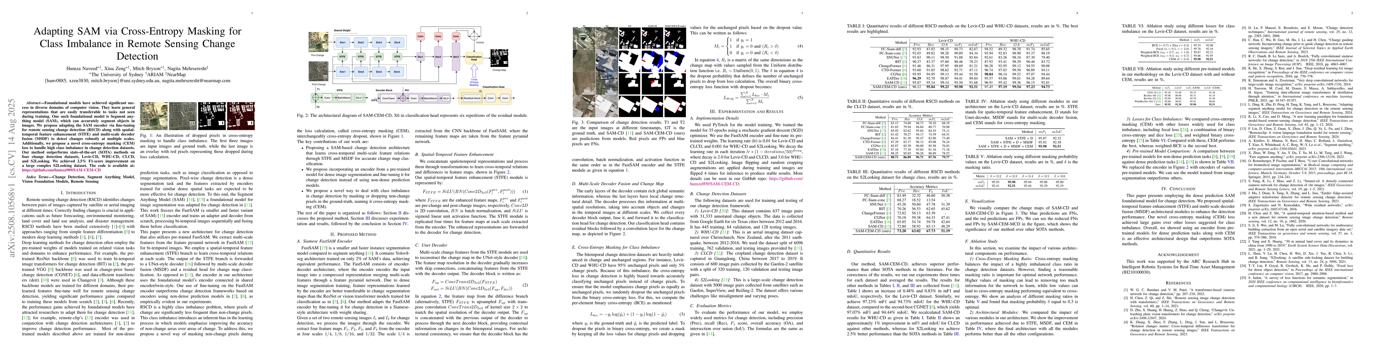 Foundational models have achieved significant success in diverse domains of computer vision. They learn general representations that are easily transferable to tasks not seen during training. One such foundational model is Segment anything model (SAM), which can accurately segment objects in images. We propose adapting the SAM encoder via fine-tuning for remote sensing change detection (RSCD) along with spatial-temporal feature enhancement (STFE) and multi-scale decoder fusion (MSDF) to detect changes robustly at multiple scales. Additionally, we propose a novel cross-entropy masking (CEM) loss to handle high class imbalance in change detection datasets. Our method outperforms state-of-the-art (SOTA) methods on four change detection datasets, Levir-CD, WHU-CD, CLCD, and S2Looking. We achieved 2.5% F1-score improvement on a large complex S2Looking dataset. The code is available at: https://github.com/humza909/SAM-CEM-CD