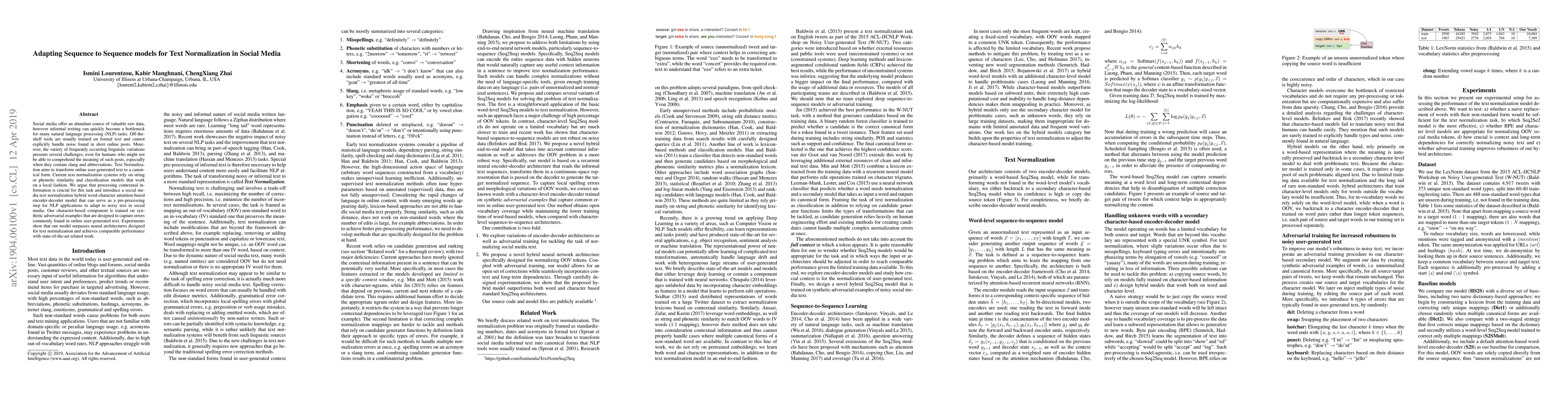 This paper proposes a hybrid encoder-decoder model with word-character attention for text normalization in social media, addressing the challenges of informal and noisy online text. The character-based component, trained on adversarial examples, enhances contextual processing, outperforming existing neural architectures and achieving competitive results.