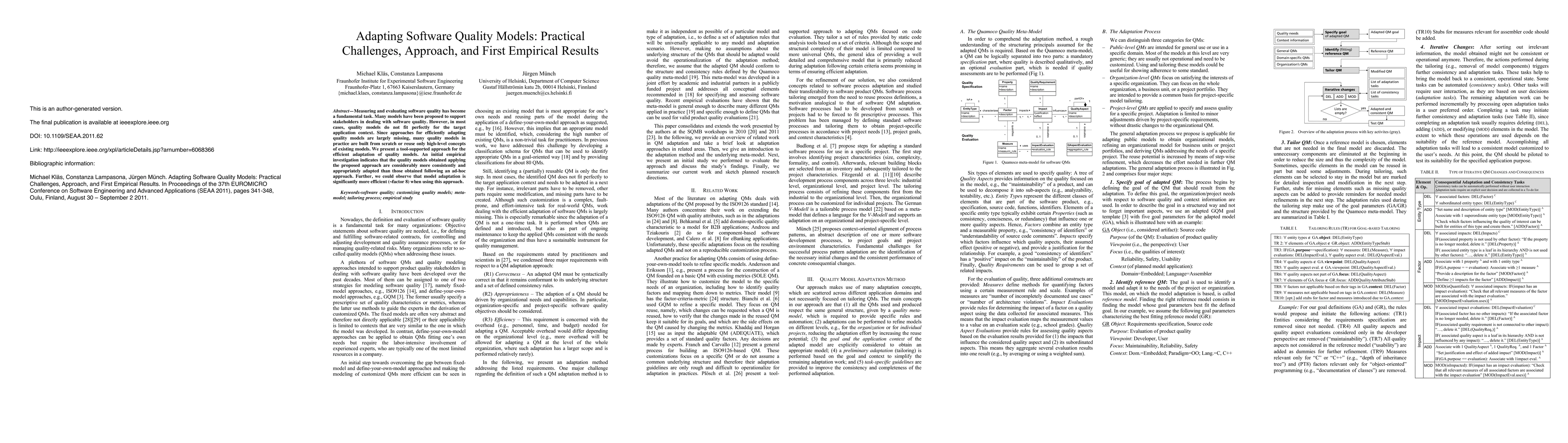 This paper presents a tool-supported approach for efficiently adapting software quality models to fit specific application contexts, demonstrating that it results in more consistent and appropriate adaptations compared to ad-hoc methods. Initial empirical results show the approach is significantly more efficient, reducing adaptation time by a factor of 8.