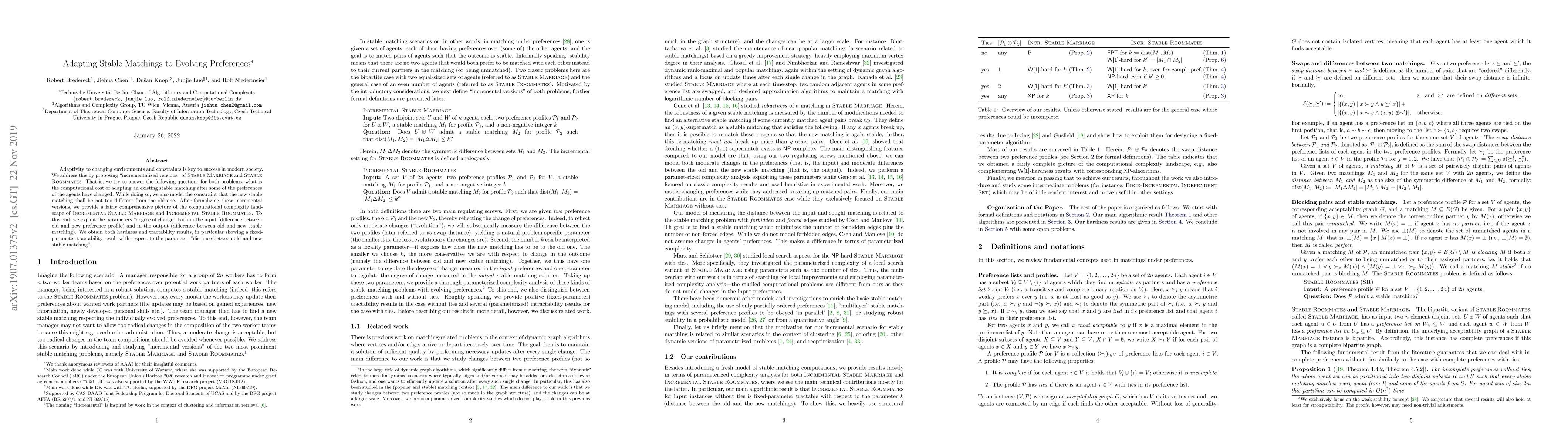 This paper proposes incremental versions of Stable Marriage and Stable Roommates to adapt existing stable matchings when preferences change, focusing on computational cost. It analyzes the complexity landscape, revealing both hardness and tractability results, especially in terms of the distance between old and new stable matchings.