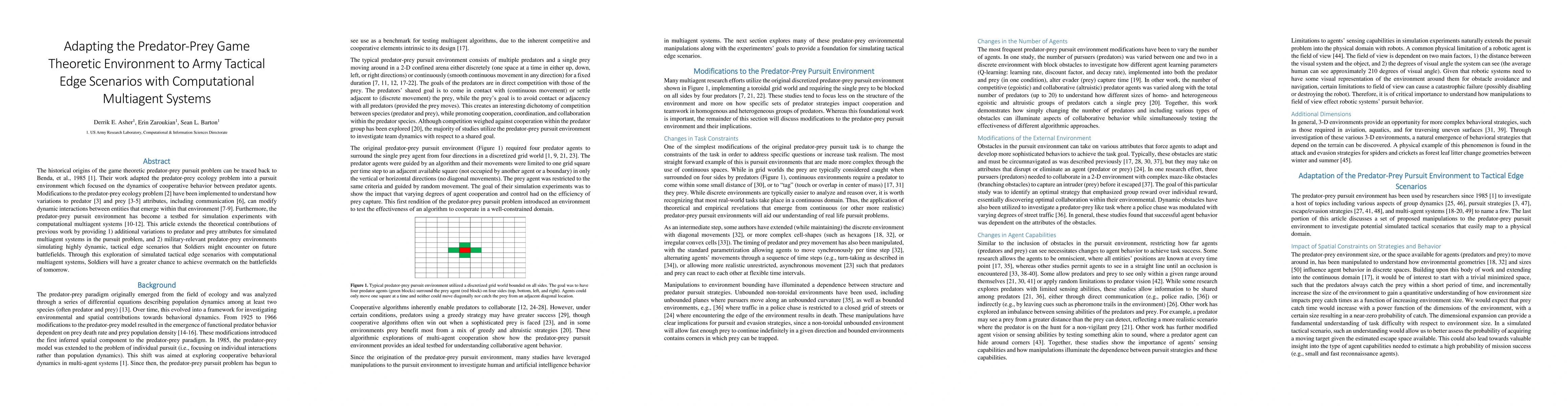 The historical origins of the game theoretic predator-prey pursuit problem can be traced back to Benda, et al., 1985 [1]. Their work adapted the predator-prey ecology problem into a pursuit environment which focused on the dynamics of cooperative behavior between predator agents. Modifications to the predator-prey ecology problem [2] have been implemented to understand how variations to predator [3] and prey [3-5] attributes, including communication [6], can modify dynamic interactions between entities that emerge within that environment [7-9]. Furthermore, the predator-prey pursuit environment has become a testbed for simulation experiments with computational multiagent systems [10-12]. This article extends the theoretical contributions of previous work by providing 1) additional variations to predator and prey attributes for simulated multiagent systems in the pursuit problem, and 2) military-relevant predator-prey environments simulating highly dynamic, tactical edge scenarios that Soldiers might encounter on future battlefields. Through this exploration of simulated tactical edge scenarios with computational multiagent systems, Soldiers will have a greater chance to achieve overmatch on the battlefields of tomorrow.