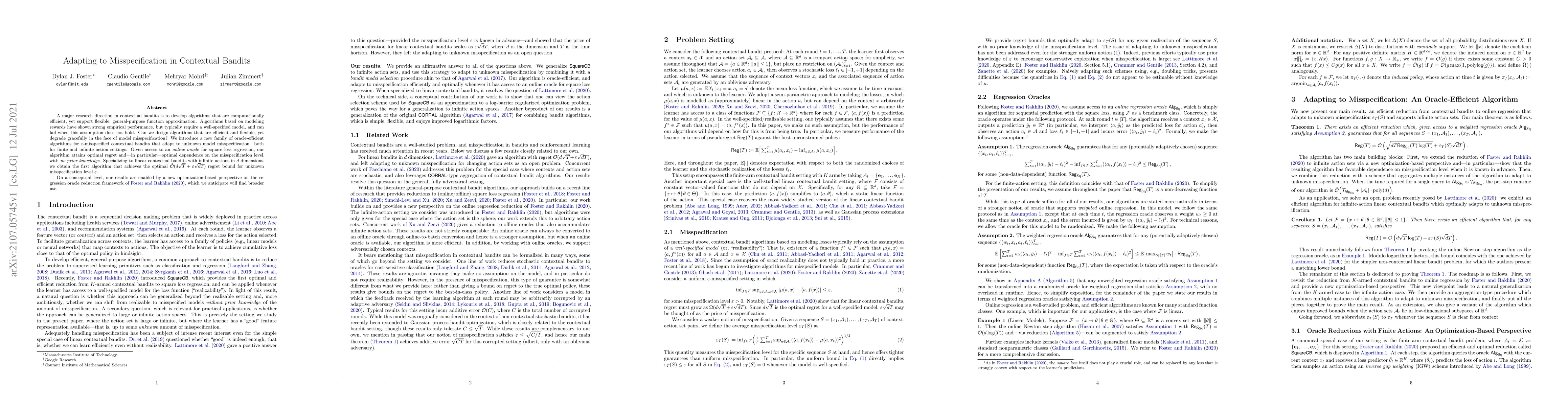 A major research direction in contextual bandits is to develop algorithms that are computationally efficient, yet support flexible, general-purpose function approximation. Algorithms based on modeling rewards have shown strong empirical performance, but typically require a well-specified model, and can fail when this assumption does not hold. Can we design algorithms that are efficient and flexible, yet degrade gracefully in the face of model misspecification? We introduce a new family of oracle-efficient algorithms for $\varepsilon$-misspecified contextual bandits that adapt to unknown model misspecification -- both for finite and infinite action settings. Given access to an online oracle for square loss regression, our algorithm attains optimal regret and -- in particular -- optimal dependence on the misspecification level, with no prior knowledge. Specializing to linear contextual bandits with infinite actions in $d$ dimensions, we obtain the first algorithm that achieves the optimal $O(d\sqrt{T} + \varepsilon\sqrt{d}T)$ regret bound for unknown misspecification level $\varepsilon$. On a conceptual level, our results are enabled by a new optimization-based perspective on the regression oracle reduction framework of Foster and Rakhlin, which we anticipate will find broader use.