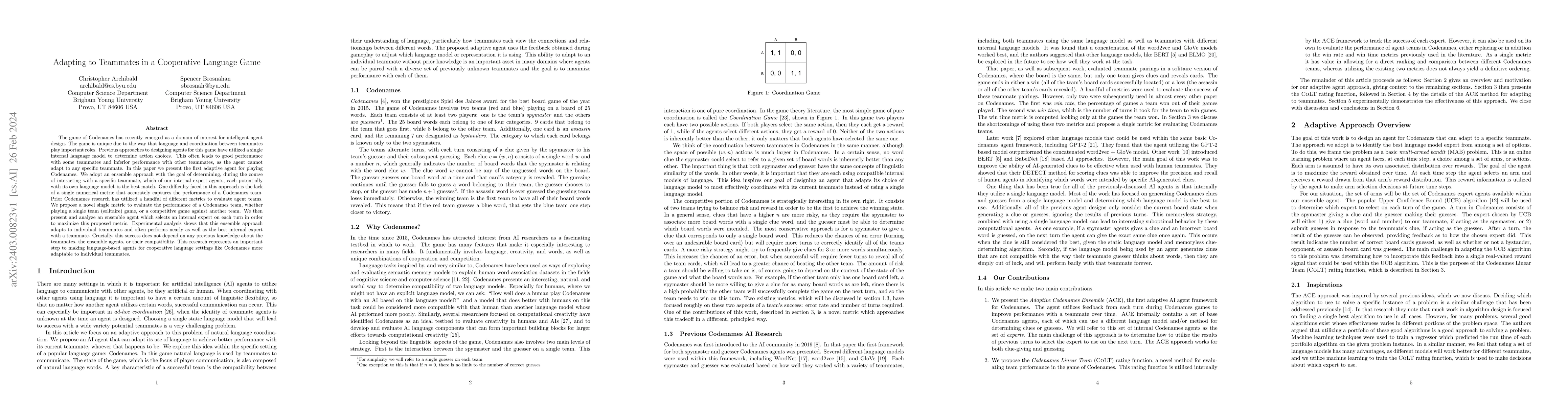 This paper introduces an adaptive ensemble agent for the game Codenames, which dynamically selects the best-suited internal expert agent with its unique language model based on ongoing interactions with a specific teammate. The authors propose a novel performance metric to evaluate Codenames teams and demonstrate that this ensemble approach significantly improves adaptability and performance without prior knowledge of teammates or agents.