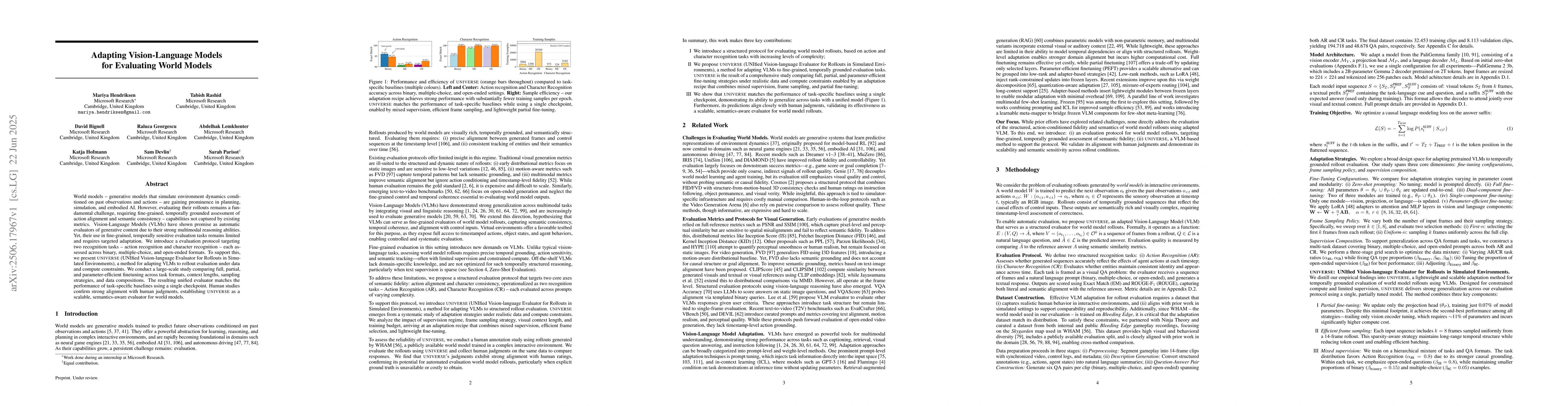 The paper introduces UNIVERSE, a method to adapt Vision-Language Models (VLMs) for evaluating world model rollouts. UNIVERSE effectively addresses the challenge of temporally grounded assessment of action alignment and semantic consistency. It demonstrates strong performance comparable to task-specific baselines and aligns with human judgments, offering a scalable, semantics-aware evaluation tool for world models.