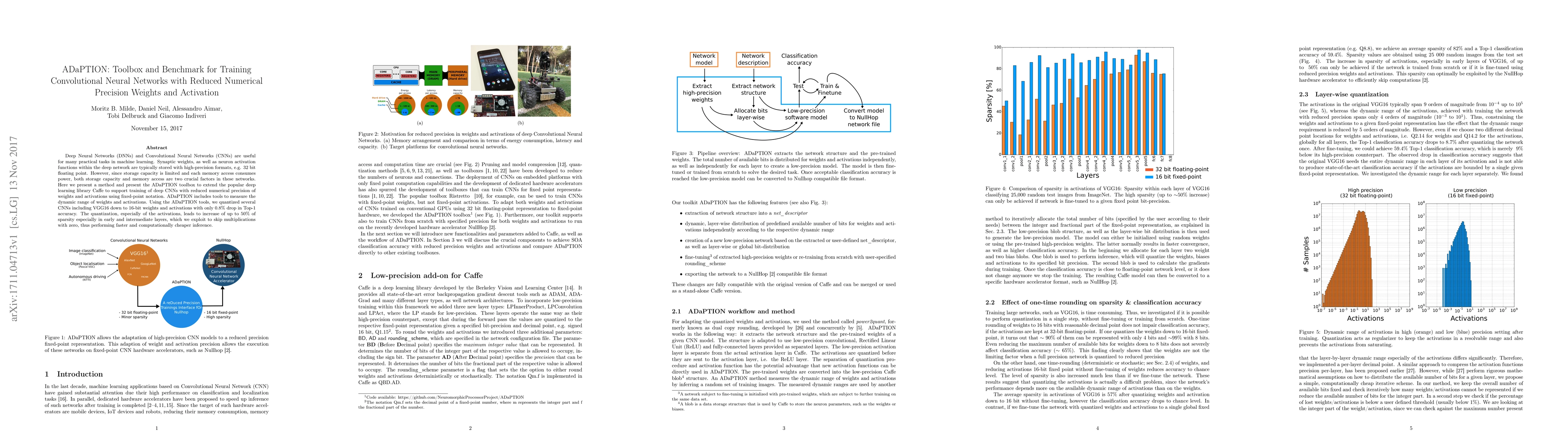 ADaPTION toolbox enables training of Convolutional Neural Networks (CNNs) with reduced numerical precision, achieving minimal accuracy loss while significantly improving computational efficiency and sparsity. The ADaPTION-trained VGG16 model maintains 99.2% Top-1 accuracy with 16-bit weights and activations, and shows up to 50% sparsity.