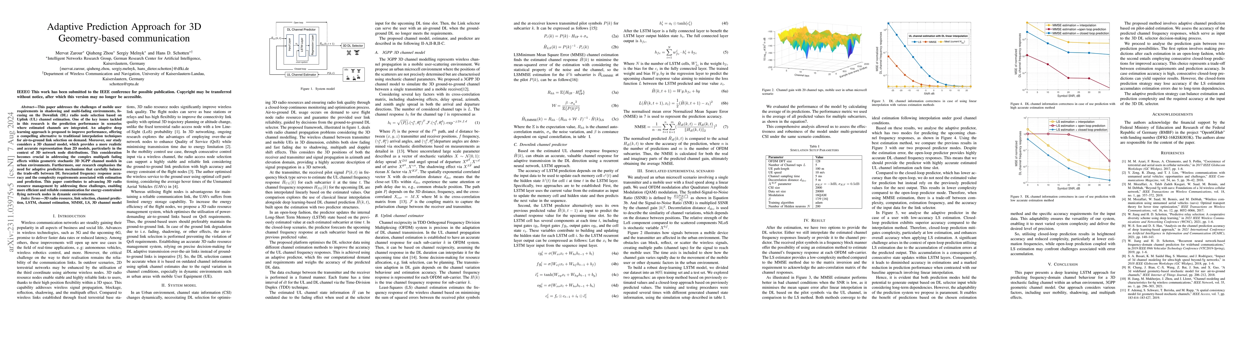 This paper proposes an adaptive deep learning method for 3D geometry-based stochastic channel prediction to enhance 3D Downlink radio node selection, addressing multipath fading and shadowing in urban environments. It introduces a 3D channel model for more accurate predictions, balancing accuracy and complexity for efficient resource management in dynamic environments.