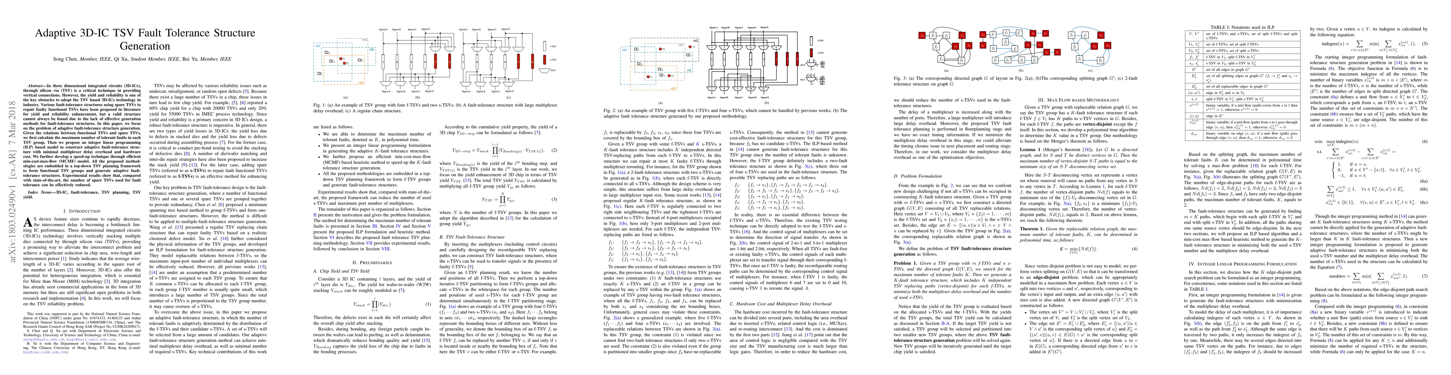 This paper proposes an adaptive method for generating fault-tolerance structures in 3D-ICs using spare TSVs to repair faulty functional TSVs. It employs an ILP model and a speed-up MCMF technique to minimize delay and cost, demonstrating reduced spare TSV usage compared to existing methods.