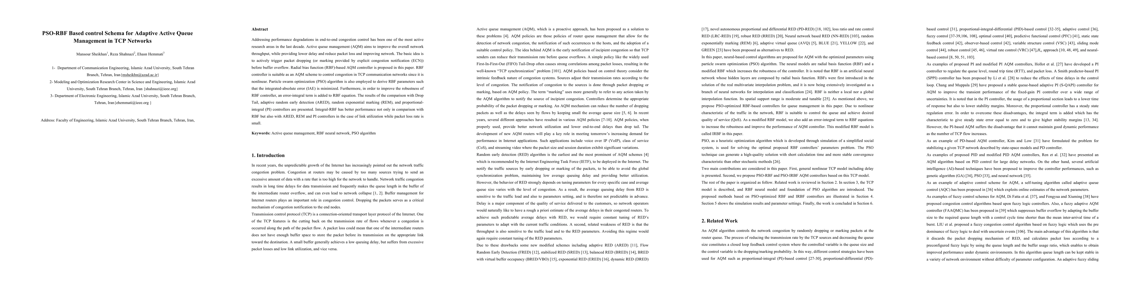 This paper proposes a Radial Bias Function (RBF)-based Active Queue Management (AQM) controller optimized using Particle Swarm Optimization (PSO) to enhance TCP communication network performance. The RBF controller, enhanced with an error-integral term, outperforms Drop Tail, ARED, REM, and PI controllers in terms of link utilization and packet loss.