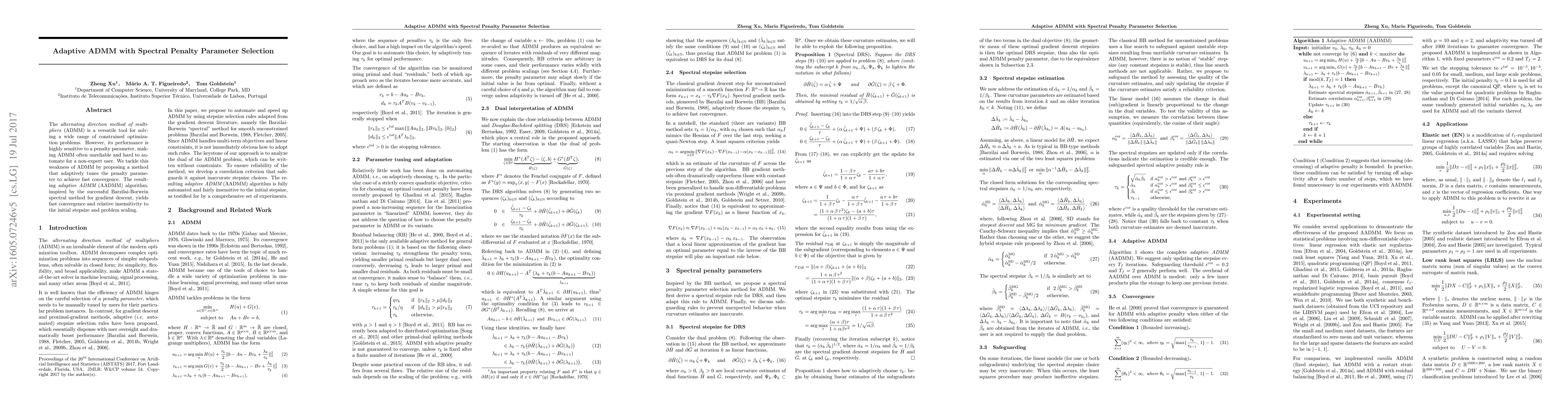 The alternating direction method of multipliers (ADMM) is a versatile tool for solving a wide range of constrained optimization problems, with differentiable or non-differentiable objective functions. Unfortunately, its performance is highly sensitive to a penalty parameter, which makes ADMM often unreliable and hard to automate for a non-expert user. We tackle this weakness of ADMM by proposing a method to adaptively tune the penalty parameters to achieve fast convergence. The resulting adaptive ADMM (AADMM) algorithm, inspired by the successful Barzilai-Borwein spectral method for gradient descent, yields fast convergence and relative insensitivity to the initial stepsize and problem scaling.