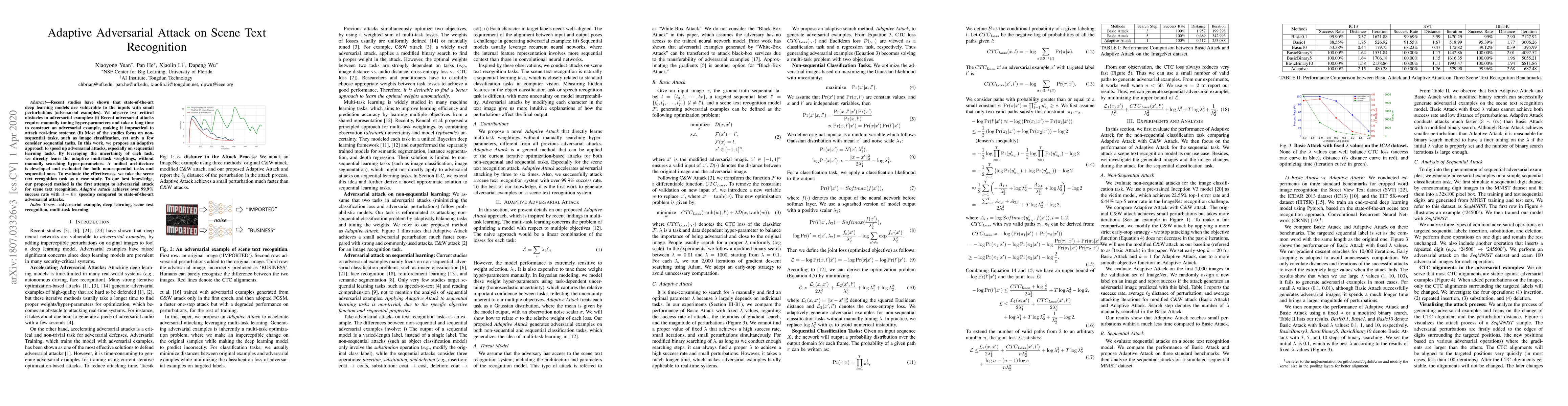 Recent studies have shown that state-of-the-art deep learning models are vulnerable to the inputs with small perturbations (adversarial examples). We observe two critical obstacles in adversarial examples: (i) Strong adversarial attacks (e.g., C&W attack) require manually tuning hyper-parameters and take a long time to construct an adversarial example, making it impractical to attack real-time systems; (ii) Most of the studies focus on non-sequential tasks, such as image classification, yet only a few consider sequential tasks. In this work, we speed up adversarial attacks, especially on sequential learning tasks. By leveraging the uncertainty of each task, we directly learn the adaptive multi-task weightings, without manually searching hyper-parameters. A unified architecture is developed and evaluated for both non-sequential tasks and sequential ones. To validate the effectiveness, we take the scene text recognition task as a case study. To our best knowledge, our proposed method is the first attempt to adversarial attack for scene text recognition. Adaptive Attack achieves over 99.9\% success rate with 3-6X speedup compared to state-of-the-art adversarial attacks.