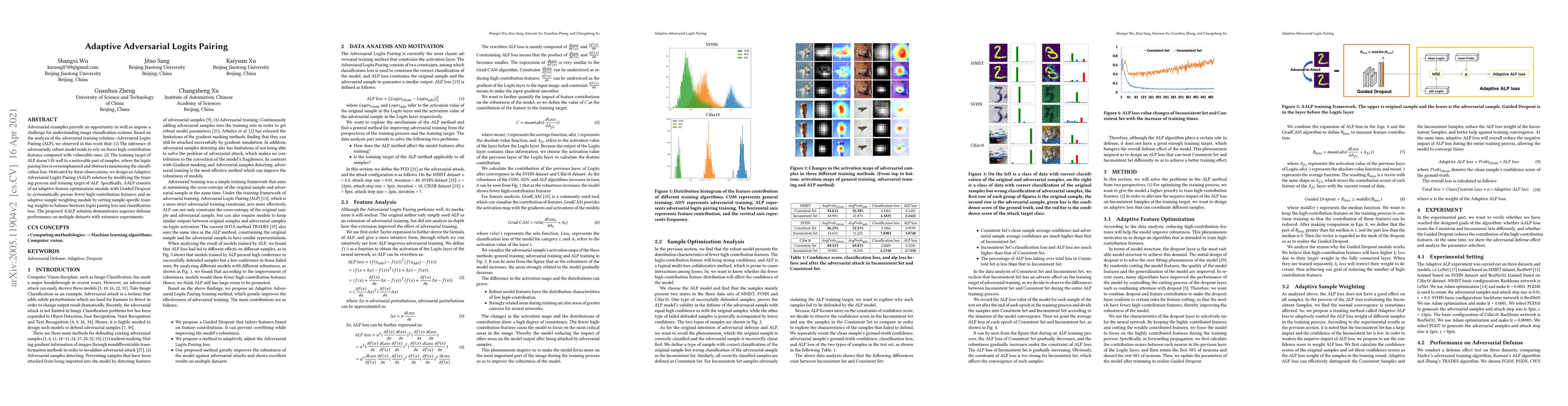 This paper proposes Adaptive Adversarial Logits Pairing (AALP) to improve adversarial training by optimizing fewer high-contribution features and balancing loss functions, achieving better defense performance on various datasets.