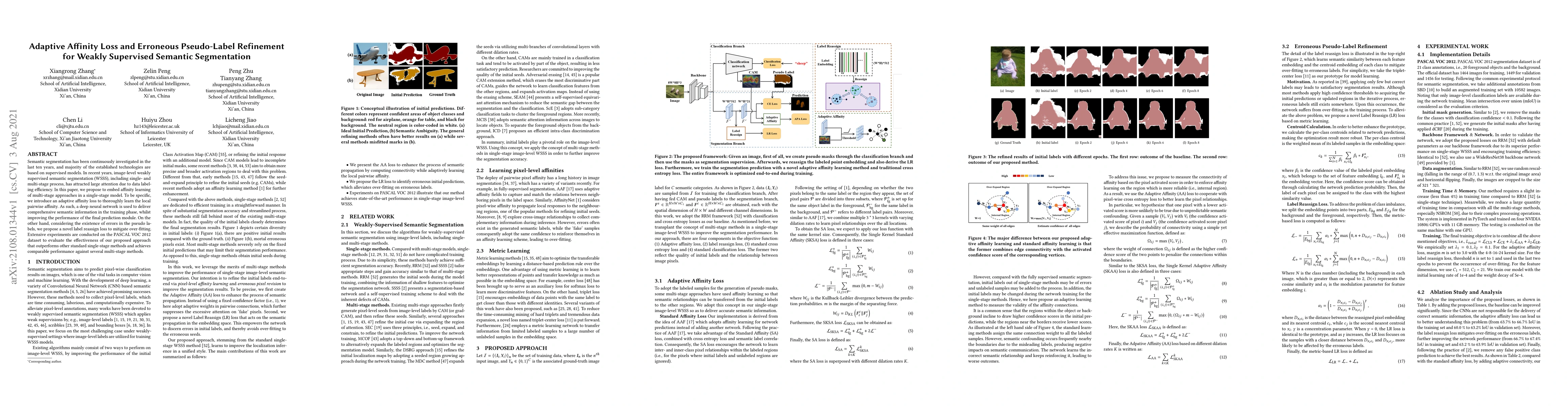 This paper proposes an adaptive affinity loss and erroneous pseudo-label refinement method for weakly supervised semantic segmentation. The approach integrates multi-stage affinity learning into a single-stage model, improving semantic information delivery and reducing overfitting via a label reassign loss, achieving superior performance on the PASCAL VOC 2012 dataset.