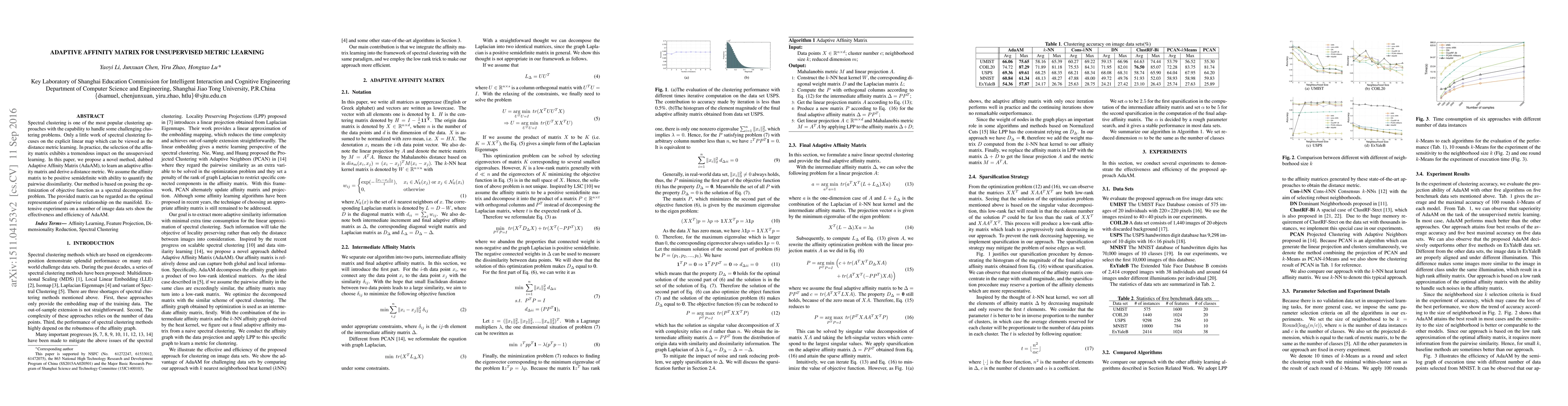 Spectral clustering is one of the most popular clustering approaches with the capability to handle some challenging clustering problems. Most spectral clustering methods provide a nonlinear map from the data manifold to a subspace. Only a little work focuses on the explicit linear map which can be viewed as the unsupervised distance metric learning. In practice, the selection of the affinity matrix exhibits a tremendous impact on the unsupervised learning. While much success of affinity learning has been achieved in recent years, some issues such as noise reduction remain to be addressed. In this paper, we propose a novel method, dubbed Adaptive Affinity Matrix (AdaAM), to learn an adaptive affinity matrix and derive a distance metric from the affinity. We assume the affinity matrix to be positive semidefinite with ability to quantify the pairwise dissimilarity. Our method is based on posing the optimization of objective function as a spectral decomposition problem. We yield the affinity from both the original data distribution and the widely-used heat kernel. The provided matrix can be regarded as the optimal representation of pairwise relationship on the manifold. Extensive experiments on a number of real-world data sets show the effectiveness and efficiency of AdaAM.