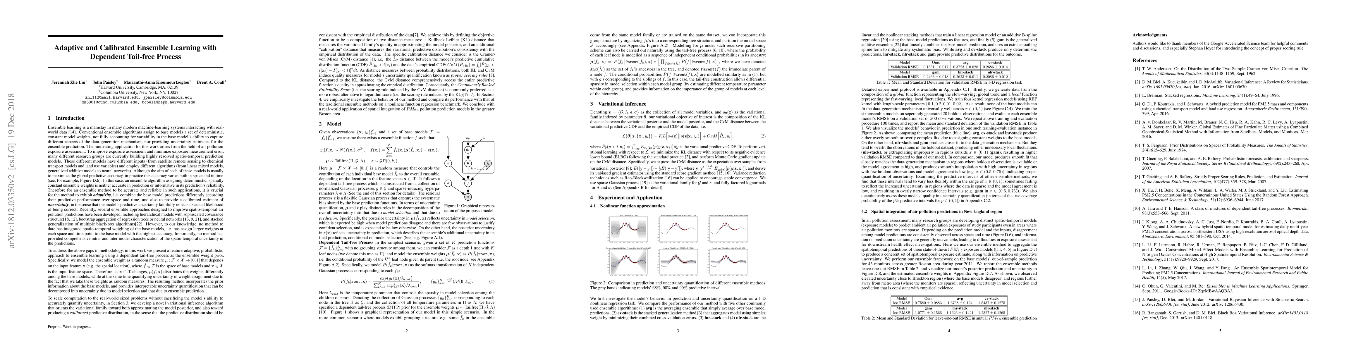 Ensemble learning is a mainstay in modern data science practice. Conventional ensemble algorithms assigns to base models a set of deterministic, constant model weights that (1) do not fully account for variations in base model accuracy across subgroups, nor (2) provide uncertainty estimates for the ensemble prediction, which could result in mis-calibrated (i.e. precise but biased) predictions that could in turn negatively impact the algorithm performance in real-word applications. In this work, we present an adaptive, probabilistic approach to ensemble learning using dependent tail-free process as ensemble weight prior. Given input feature $\mathbf{x}$, our method optimally combines base models based on their predictive accuracy in the feature space $\mathbf{x} \in \mathcal{X}$, and provides interpretable uncertainty estimates both in model selection and in ensemble prediction. To encourage scalable and calibrated inference, we derive a structured variational inference algorithm that jointly minimize KL objective and the model's calibration score (i.e. Continuous Ranked Probability Score (CRPS)). We illustrate the utility of our method on both a synthetic nonlinear function regression task, and on the real-world application of spatio-temporal integration of particle pollution prediction models in New England.