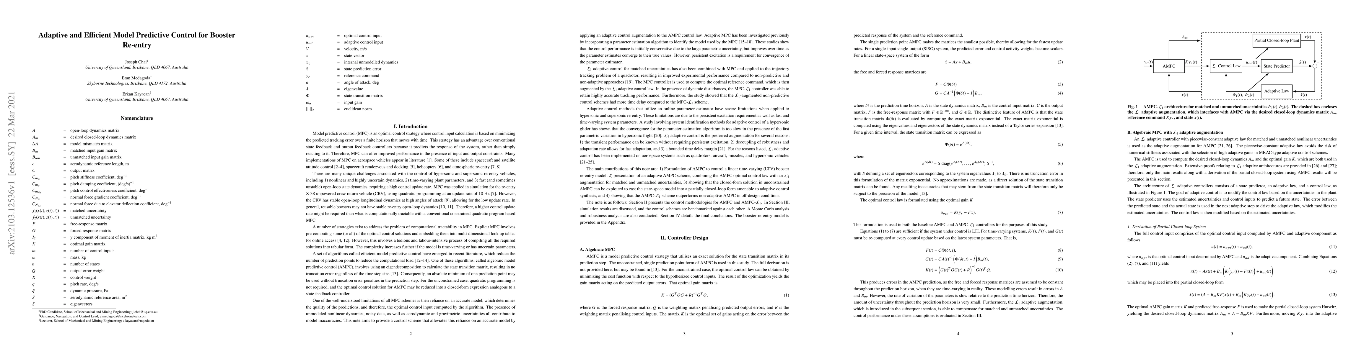 This paper proposes an adaptive and efficient model predictive control (MPC) strategy for booster reentry, leveraging the ability to predict system responses to optimize control inputs and handle constraints. The method aims to improve performance over conventional feedback controllers, with applications in aerospace vehicles including spacecraft and atmospheric re-entry.