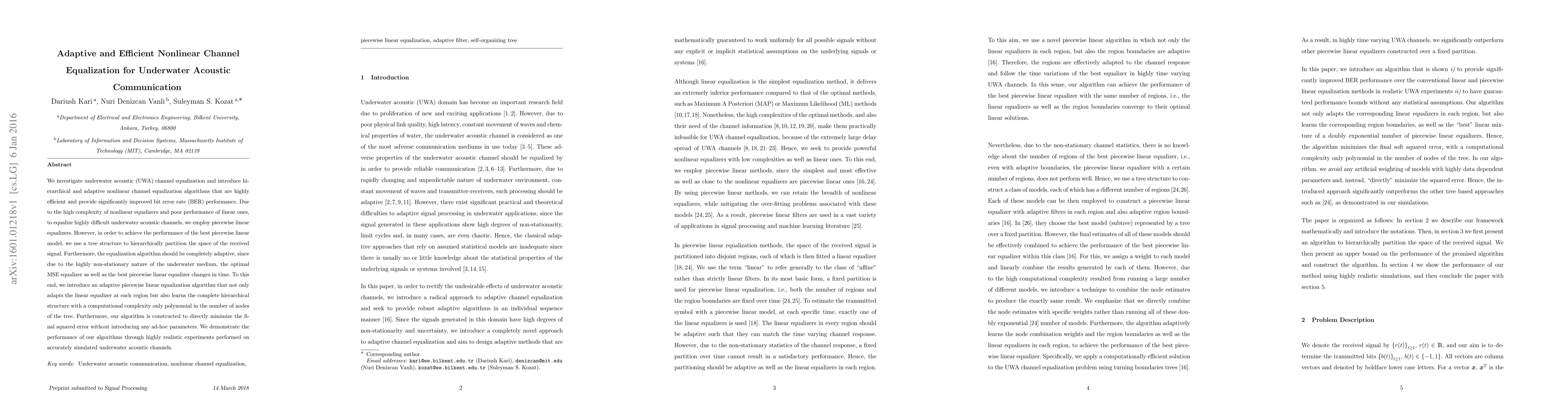 This paper introduces adaptive nonlinear channel equalization algorithms for underwater acoustic communication, employing hierarchical and adaptive piecewise linear equalizers to significantly improve bit error rate performance. The proposed adaptive algorithm efficiently learns the hierarchical structure and minimizes squared error without ad-hoc parameters, validated through realistic simulations.