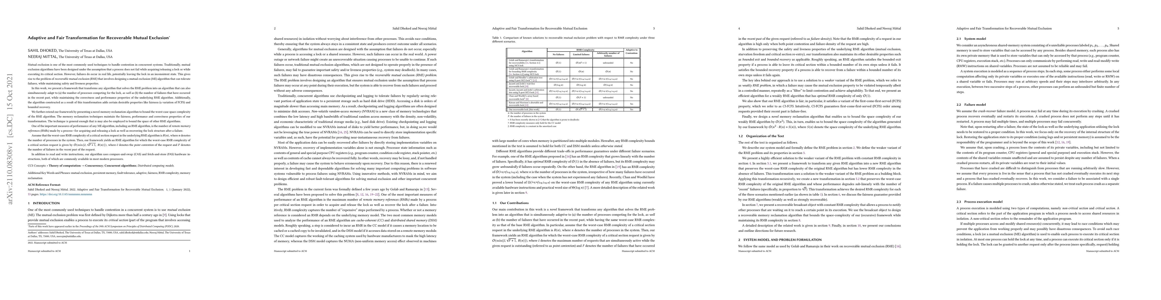 Mutual exclusion is one of the most commonly used techniques to handle contention in concurrent systems. Traditionally, mutual exclusion algorithms have been designed under the assumption that a process does not fail while acquiring/releasing a lock or while executing its critical section. However, failures do occur in real life, potentially leaving the lock in an inconsistent state. This gives rise to the problem of recoverable mutual exclusion (RME) that involves designing a mutual exclusion (ME) algorithm that can tolerate failures, while maintaining safety and liveness properties. In this work, we present a framework that transforms any algorithm that solves the RME problem into an algorithm that can also simultaneously adapt to (1) the number of processes competing for the lock, as well as (2) the number of failures that have occurred in the recent past, while maintaining the correctness and performance properties of the underlying RME algorithm. Additionally, the algorithm constructed as a result of this transformation adds certain desirable properties like fairness (a variation of FCFS) and bounded recovery. Assume that the worst-case RMR complexity of a critical section request in the underlying RME algorithm is $R(n)$. Then, our framework yields an RME algorithm for which the worst-case RMR complexity of a critical section request is given by $\mathcal{O}(\min \{\ddot{c}, \sqrt{F+1}, R(n)\})$, where $\ddot{c}$ denotes the point contention of the request and $F$ denotes the number of failures in the recent past of the request. We further extend our framework by presenting a novel memory reclamation algorithm to bound the worst-case space complexity of the RME algorithm. The memory reclamation techniques maintain the fairness, performance and correctness properties of our transformation and is general enough to be employed to bound the space of other RME algorithms.