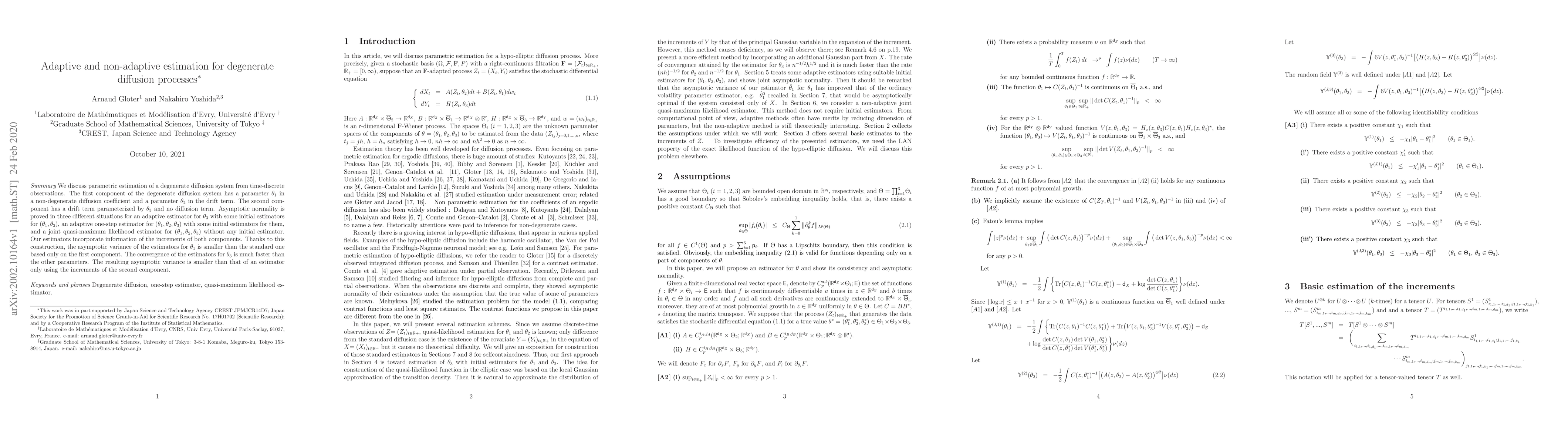 We discuss parametric estimation of a degenerate diffusion system from time-discrete observations. The first component of the degenerate diffusion system has a parameter $\theta_1$ in a non-degenerate diffusion coefficient and a parameter $\theta_2$ in the drift term. The second component has a drift term parameterized by $\theta_3$ and no diffusion term. Asymptotic normality is proved in three different situations for an adaptive estimator for $\theta_3$ with some initial estimators for ($\theta_1$ , $\theta_2$), an adaptive one-step estimator for ($\theta_1$ , $\theta_2$ , $\theta_3$) with some initial estimators for them, and a joint quasi-maximum likelihood estimator for ($\theta_1$ , $\theta_2$ , $\theta_3$) without any initial estimator. Our estimators incorporate information of the increments of both components. Thanks to this construction, the asymptotic variance of the estimators for $\theta_1$ is smaller than the standard one based only on the first component. The convergence of the estimators for $\theta_3$ is much faster than the other parameters. The resulting asymptotic variance is smaller than that of an estimator only using the increments of the second component.