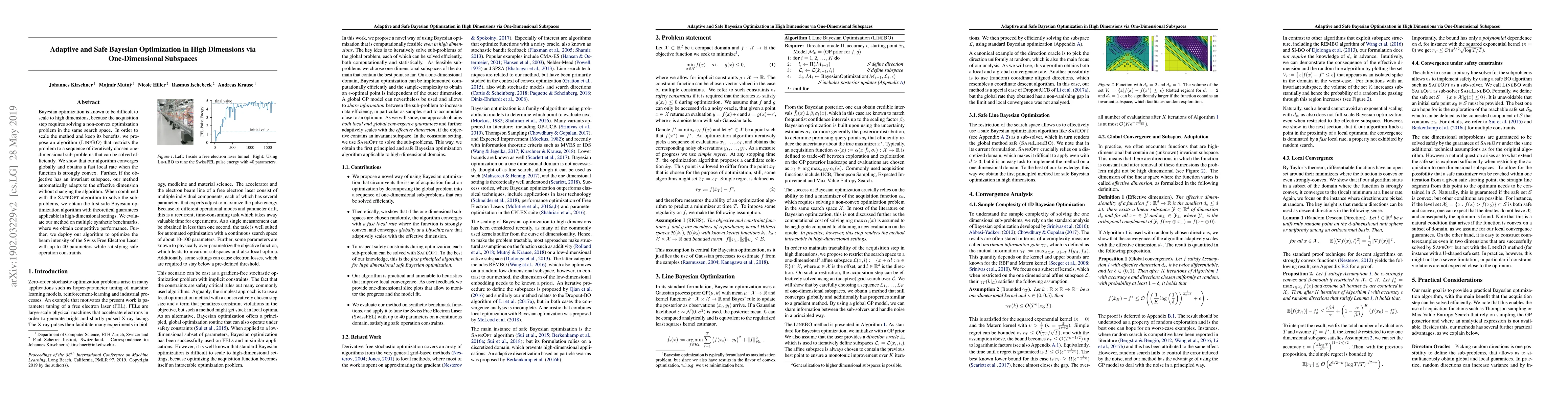 Bayesian optimization is known to be difficult to scale to high dimensions, because the acquisition step requires solving a non-convex optimization problem in the same search space. In order to scale the method and keep its benefits, we propose an algorithm (LineBO) that restricts the problem to a sequence of iteratively chosen one-dimensional sub-problems that can be solved efficiently. We show that our algorithm converges globally and obtains a fast local rate when the function is strongly convex. Further, if the objective has an invariant subspace, our method automatically adapts to the effective dimension without changing the algorithm. When combined with the SafeOpt algorithm to solve the sub-problems, we obtain the first safe Bayesian optimization algorithm with theoretical guarantees applicable in high-dimensional settings. We evaluate our method on multiple synthetic benchmarks, where we obtain competitive performance. Further, we deploy our algorithm to optimize the beam intensity of the Swiss Free Electron Laser with up to 40 parameters while satisfying safe operation constraints.