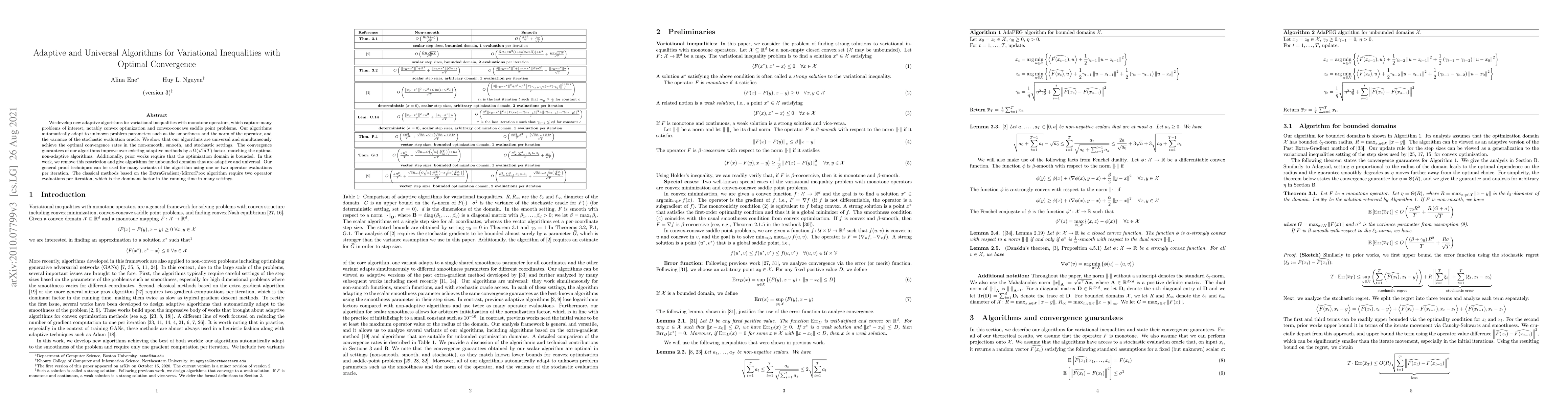 This paper introduces adaptive algorithms for variational inequalities that adapt to unknown parameters and achieve optimal convergence rates across various settings, including non-smooth, smooth, and stochastic environments. Unlike prior methods, these algorithms work for unbounded domains without requiring bounded optimization domains.