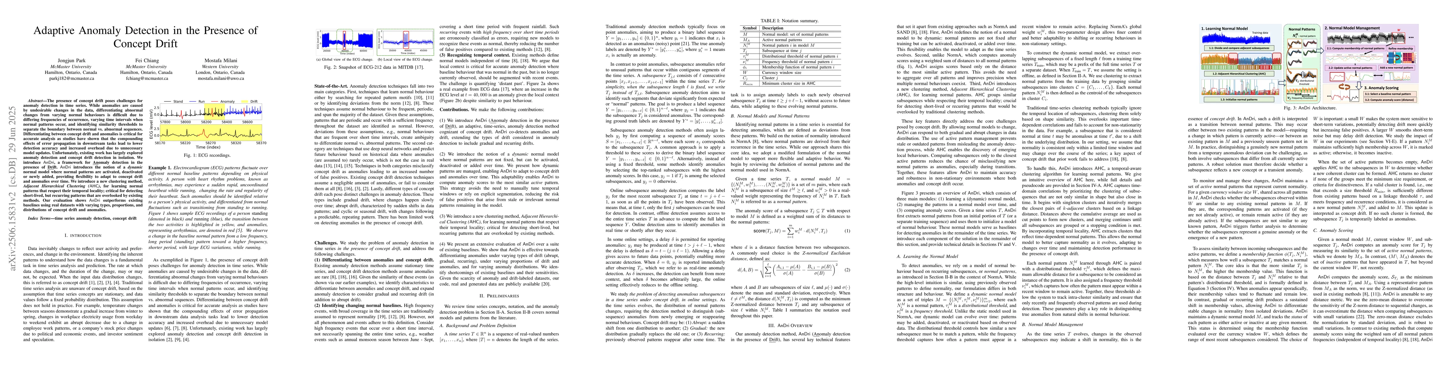 Data changes to reflect evolving user behaviour, preferences, and changes in the environment. Such changes may occur due to expected shifts in the data distribution, i.e., concept drift, or unexpected anomalous changes. The presence of concept drift poses challenges for anomaly detection in time series. While anomalies are caused by undesirable changes in the data, differentiating abnormal changes from varying normal behaviours is difficult due to differing frequencies of occurrence, varying time intervals when normal patterns occur. Differentiating between concept drift and anomalies is critical for accurate analysis as studies have shown that the compounding effects of error propagation in downstream data analysis tasks lead to lower detection accuracy and increased overhead due to unnecessary model updates. Unfortunately, existing work has largely explored anomaly detection and concept drift detection in isolation. We develop AnDri, a system for Anomaly detection in the presence of Drift, which adjusts the normal patterns temporally, and distinguish abnormal subsequences and new concepts. Moreover, it introduces a new clustering method, Adjacent Hierarchical Clustering (AHC), which groups similar subsequences while respecting their temporal locality.