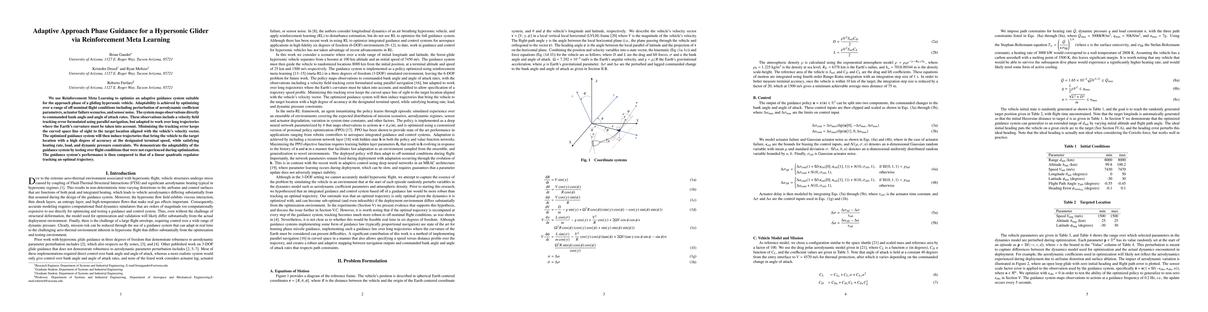 We use Reinforcement Meta Learning to optimize an adaptive guidance system suitable for the approach phase of a gliding hypersonic vehicle. Adaptability is achieved by optimizing over a range of off-nominal flight conditions including perturbation of aerodynamic coefficient parameters, actuator failure scenarios, and sensor noise. The system maps observations directly to commanded bank angle and angle of attack rates. These observations include a velocity field tracking error formulated using parallel navigation, but adapted to work over long trajectories where the Earth's curvature must be taken into account. Minimizing the tracking error keeps the curved space line of sight to the target location aligned with the vehicle's velocity vector. The optimized guidance system will then induce trajectories that bring the vehicle to the target location with a high degree of accuracy at the designated terminal speed, while satisfying heating rate, load, and dynamic pressure constraints. We demonstrate the adaptability of the guidance system by testing over flight conditions that were not experienced during optimization. The guidance system's performance is then compared to that of a linear quadratic regulator tracking an optimal trajectory.