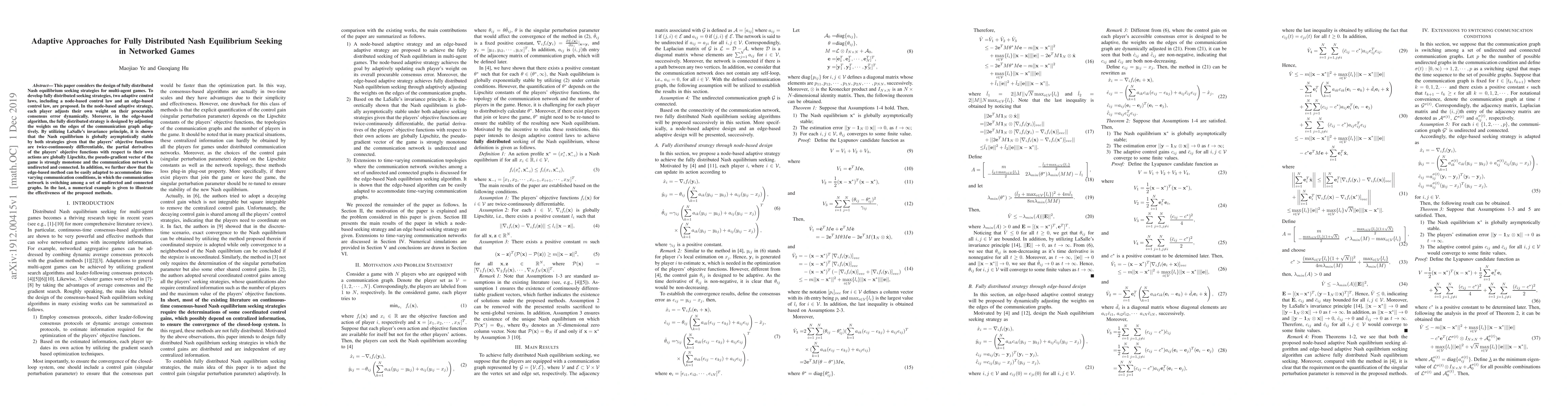 This paper proposes adaptive control laws for fully distributed Nash equilibrium seeking in multi-agent games, demonstrating global asymptotic stability using LaSalle's invariance principle. The adaptive strategies include node-based and edge-based methods, with the latter also accommodating time-varying communication conditions.