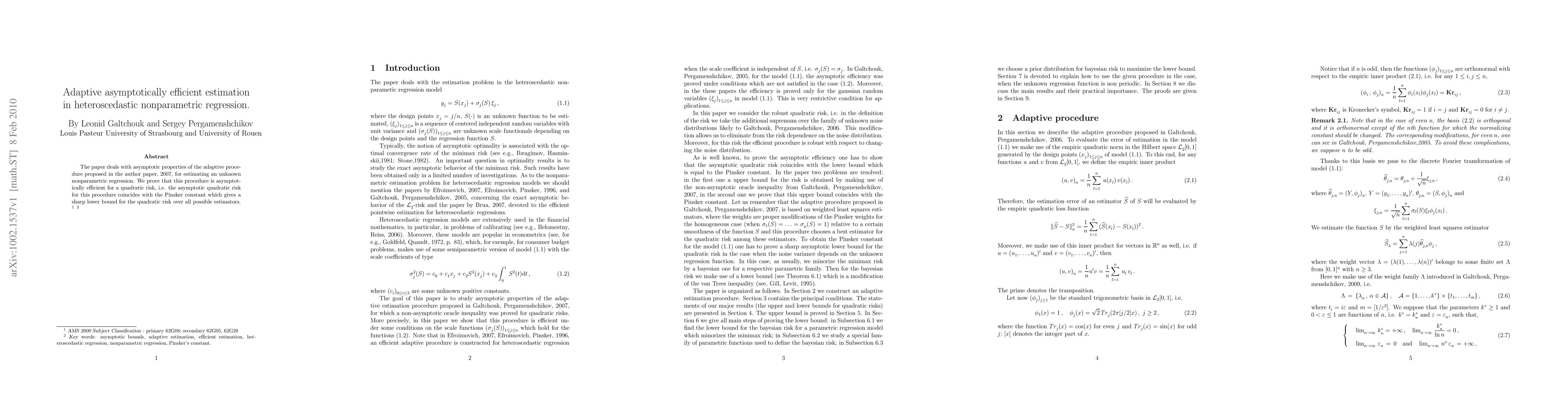 This paper proves the asymptotic efficiency of an adaptive estimation procedure for heteroscedastic nonparametric regression, demonstrating that it achieves the optimal quadratic risk bound, known as the Pinsker constant.