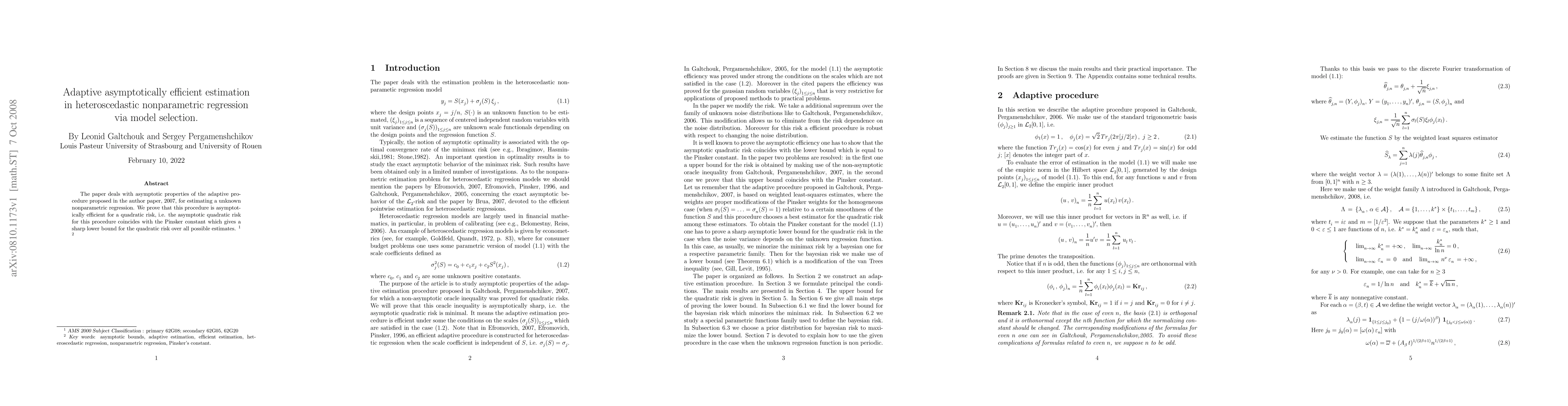 This paper investigates the asymptotic properties of an adaptive estimation procedure for heteroscedastic nonparametric regression, proving its asymptotic efficiency by showing that its quadratic risk matches the Pinsker constant, the lowest bound for such risks among all possible estimators.