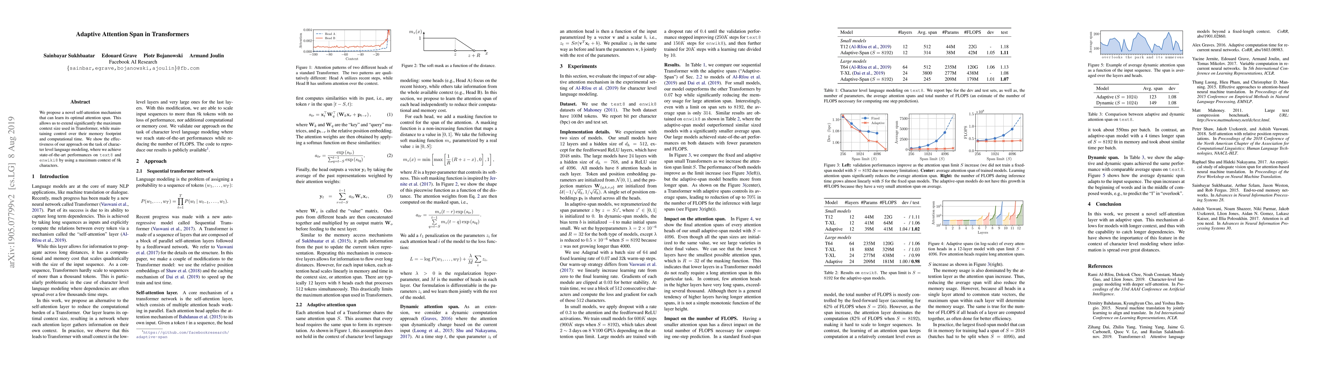 This paper introduces a self-attention mechanism that dynamically adjusts its attention span, enabling Transformers to utilize larger context sizes without increasing memory and computational costs. The proposed method achieves top performance in character-level language modeling on text8 and enwiki8 datasets.