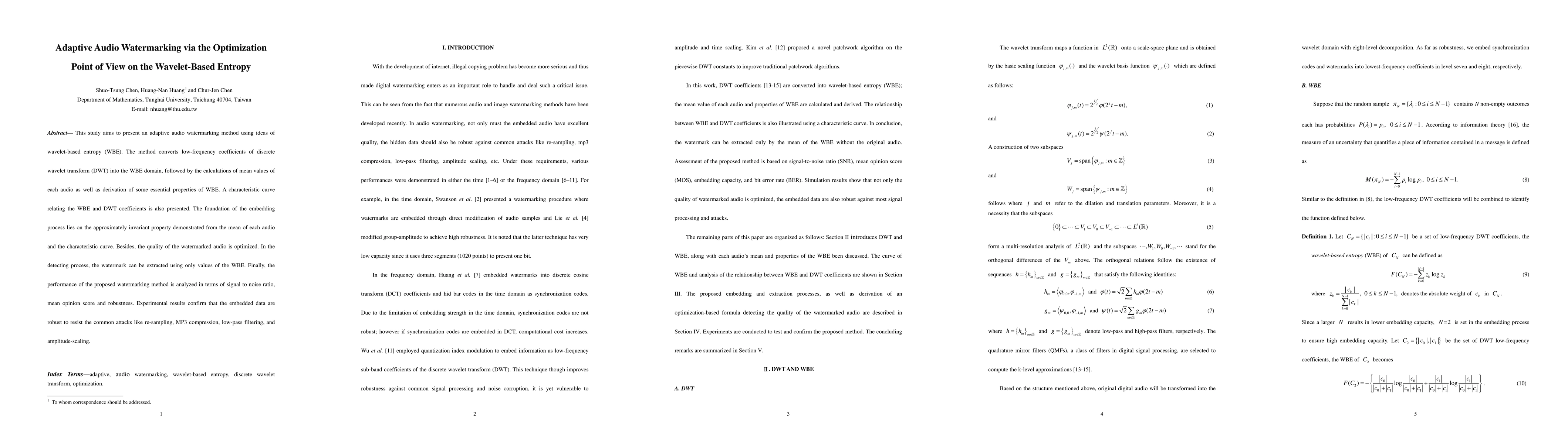 This paper proposes an adaptive audio watermarking method using wavelet-based entropy (WBE) and optimization techniques to enhance robustness and quality. The method embeds watermarks based on the invariant properties of WBE and DWT coefficients, ensuring robustness against various attacks.