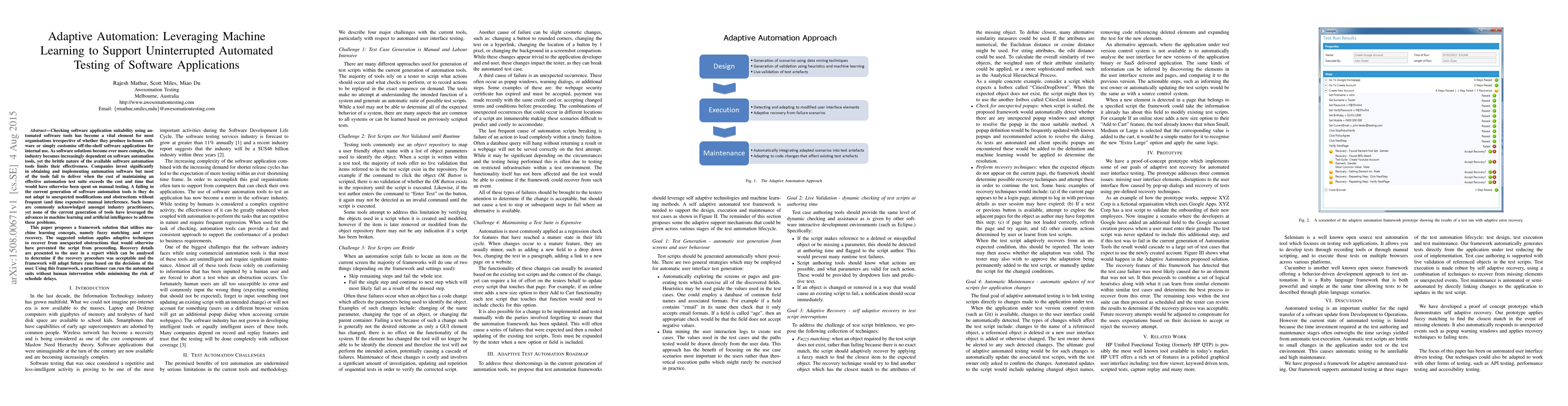 This paper proposes a framework leveraging machine learning for adaptive automation in software testing, addressing the brittleness of current tools by using fuzzy matching and error recovery to handle unexpected modifications without manual intervention. The framework adapts based on user feedback, aiming to minimize schedule delays in automated testing.