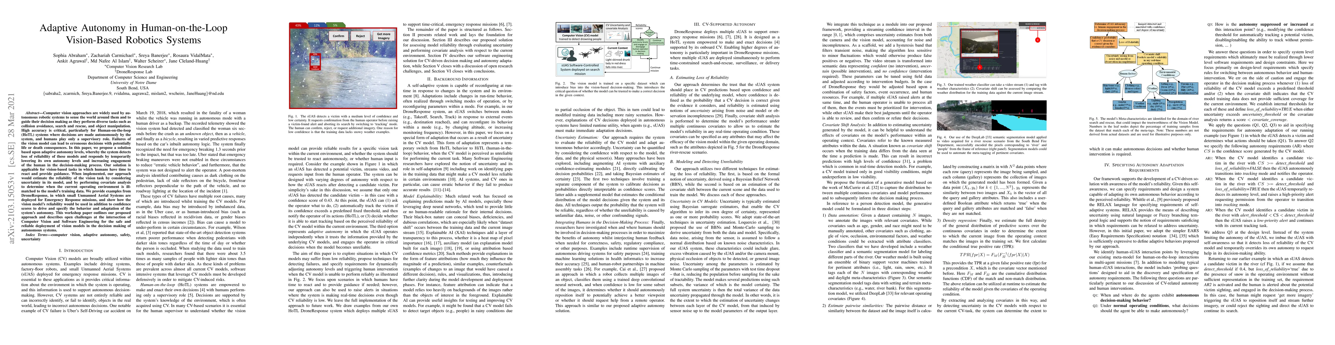 Computer vision approaches are widely used by autonomous robotic systems to sense the world around them and to guide their decision making as they perform diverse tasks such as collision avoidance, search and rescue, and object manipulation. High accuracy is critical, particularly for Human-on-the-loop (HoTL) systems where decisions are made autonomously by the system, and humans play only a supervisory role. Failures of the vision model can lead to erroneous decisions with potentially life or death consequences. In this paper, we propose a solution based upon adaptive autonomy levels, whereby the system detects loss of reliability of these models and responds by temporarily lowering its own autonomy levels and increasing engagement of the human in the decision-making process. Our solution is applicable for vision-based tasks in which humans have time to react and provide guidance. When implemented, our approach would estimate the reliability of the vision task by considering uncertainty in its model, and by performing covariate analysis to determine when the current operating environment is ill-matched to the model's training data. We provide examples from DroneResponse, in which small Unmanned Aerial Systems are deployed for Emergency Response missions, and show how the vision model's reliability would be used in addition to confidence scores to drive and specify the behavior and adaptation of the system's autonomy. This workshop paper outlines our proposed approach and describes open challenges at the intersection of Computer Vision and Software Engineering for the safe and reliable deployment of vision models in the decision making of autonomous systems.