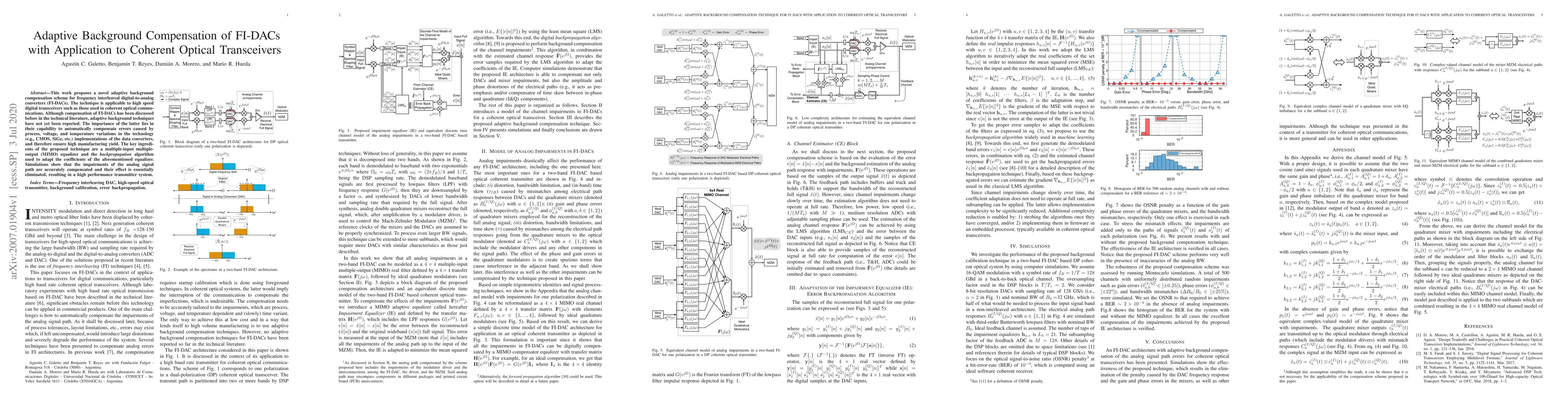 This work proposes a novel adaptive background compensation scheme for frequency interleaved digital-to-analog converters (FI-DACs). The technique is applicable to high speed digital transceivers such as those used in coherent optical communications. Although compensation of FI-DACs has been discussed before in the technical literature, adaptive background techniques have not yet been reported. The importance of the latter lies in their capability to automatically compensate errors caused by process, voltage, and temperature variations in the echnology (e.g., CMOS, SiGe, etc.) implementations of the data converters, and therefore ensure high manufacturing yield. The key ingredients of the proposed technique are a multiple-input multiple-output (MIMO) equalizer and the backpropagation algorithm used to adapt the coefficients of the aforementioned equalizer. Simulations show that the impairments of the analog signal path are accurately compensated and their effect is essentially eliminated, resulting in a high performance transmitter system.
