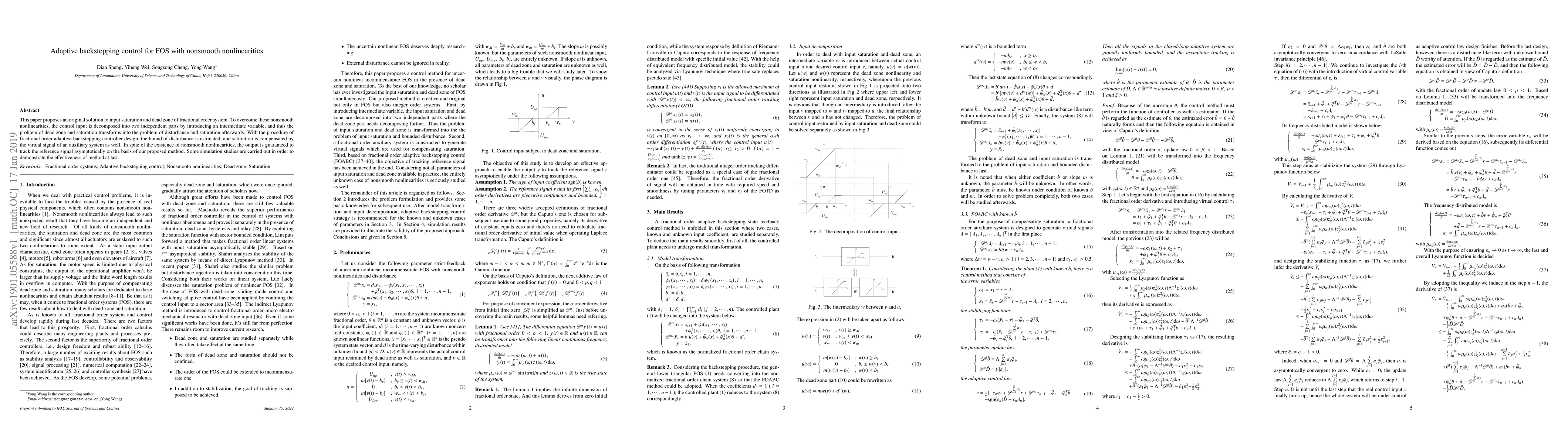 This paper proposes an original solution to input saturation and dead zone of fractional order system. To overcome these nonsmooth nonlinearities, the control input is decomposed into two independent parts by introducing an intermediate variable, and thus the problem of dead zone and saturation transforms into the problem of disturbance and saturation afterwards. With the procedure of fractional order adaptive backstepping controller design, the bound of disturbance is estimated, and saturation is compensated by the virtual signal of an auxiliary system as well. In spite of the existence of nonsmooth nonlinearities, the output is guaranteed to track the reference signal asymptotically on the basis of our proposed method. Some simulation studies are carried out in order to demonstrate the effectiveness of method at last.