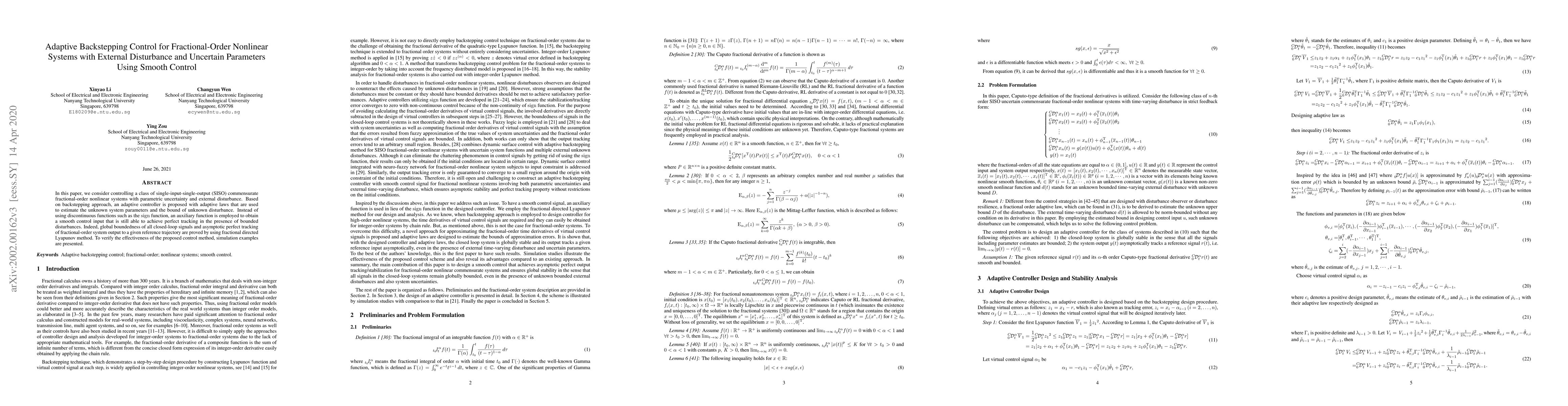 This paper proposes an adaptive backstepping control method for fractional-order nonlinear systems with uncertainties and external disturbances. It employs a smooth auxiliary function instead of discontinuous functions to achieve perfect tracking, ensuring global boundedness and asymptotic tracking via a fractional directed Lyapunov method.