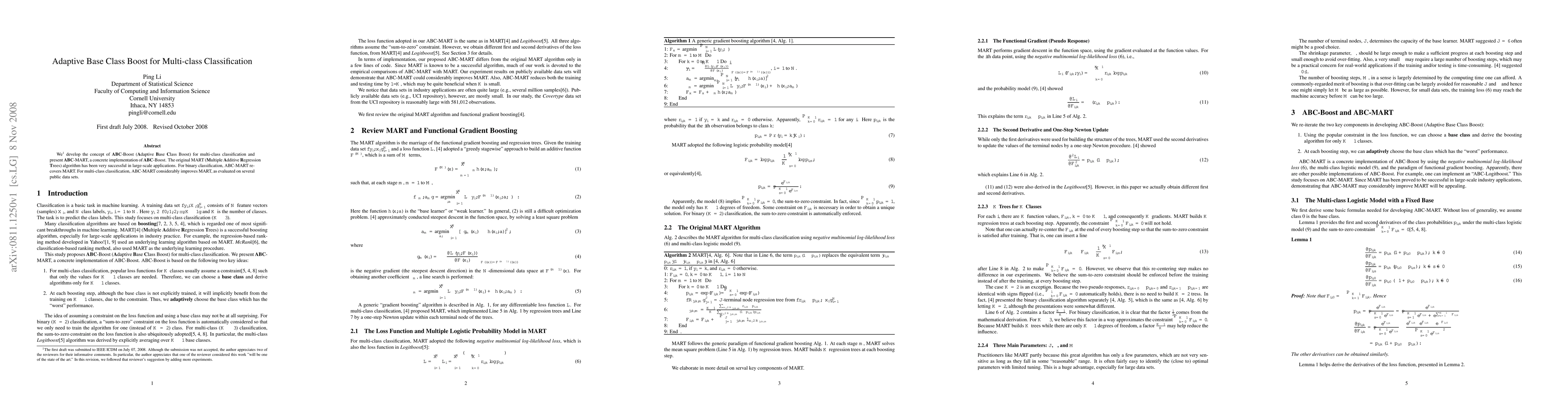 We develop the concept of ABC-Boost (Adaptive Base Class Boost) for multi-class classification and present ABC-MART, a concrete implementation of ABC-Boost. The original MART (Multiple Additive Regression Trees) algorithm has been very successful in large-scale applications. For binary classification, ABC-MART recovers MART. For multi-class classification, ABC-MART considerably improves MART, as evaluated on several public data sets.