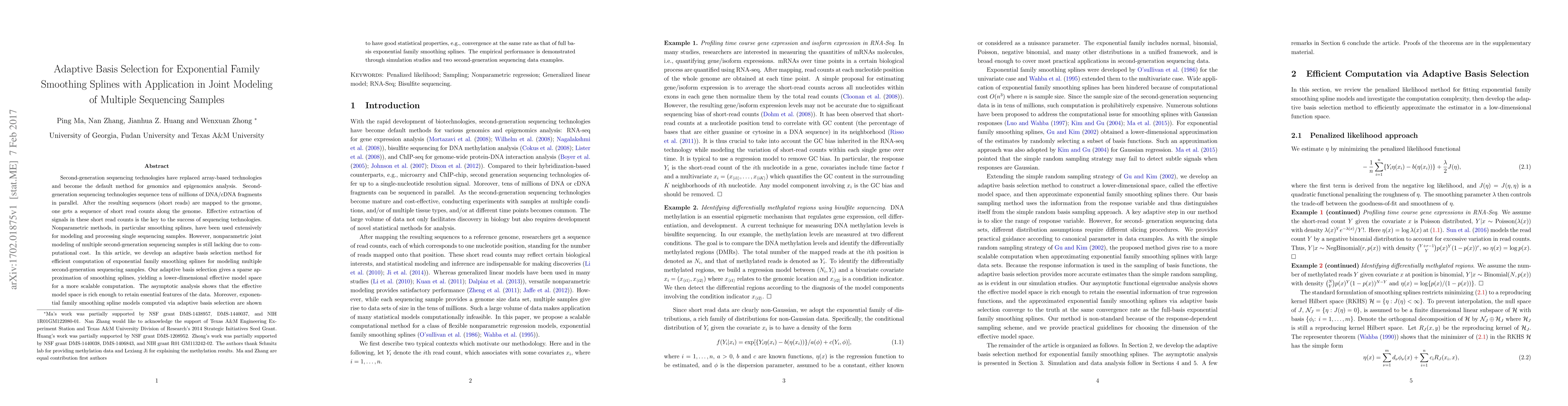 This paper develops an adaptive basis selection method for efficient computation of exponential family smoothing splines to model multiple sequencing samples, addressing computational challenges. The method provides a sparse approximation, enabling scalable computation while retaining essential data features and maintaining statistical properties.