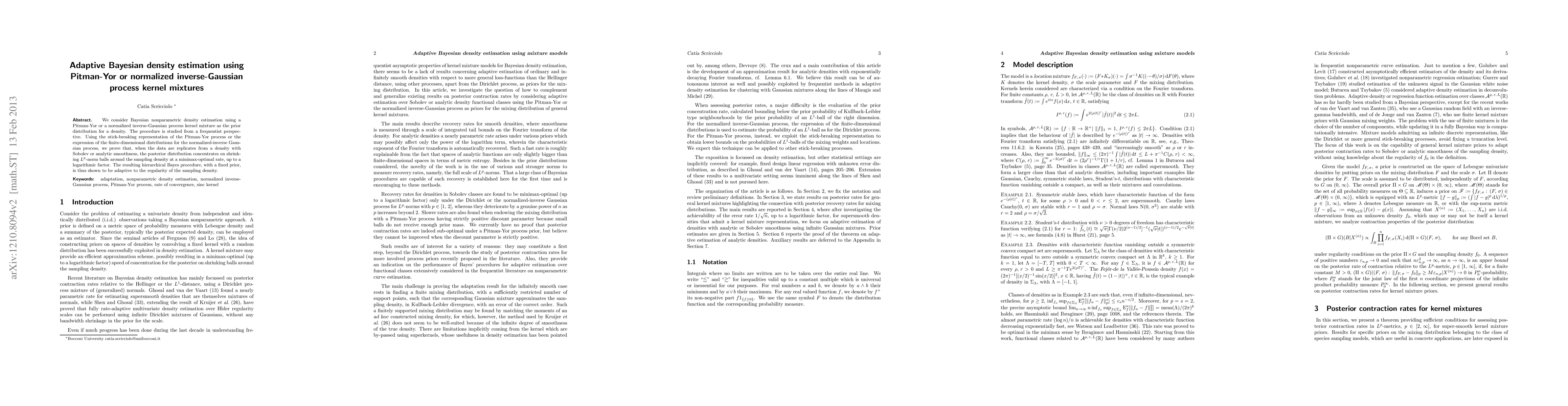 This paper proposes Bayesian nonparametric density estimation using Pitman-Yor or normalized inverse-Gaussian process kernel mixtures, demonstrating adaptive concentration of the posterior around the true density at a nearly parametric rate, thus proving the method's adaptability to varying smoothness levels.
