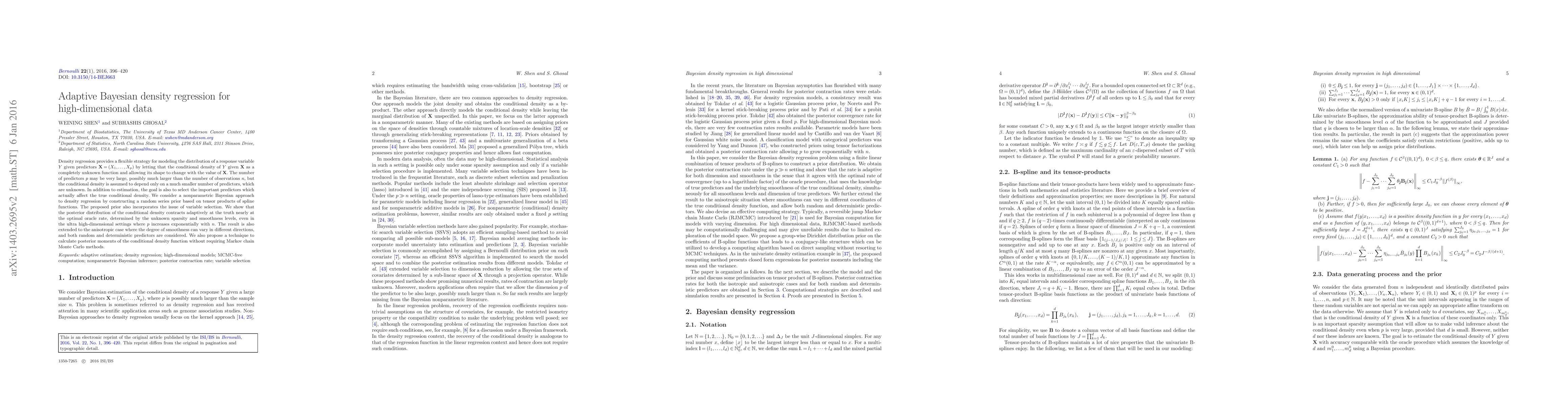 Density regression provides a flexible strategy for modeling the distribution of a response variable $Y$ given predictors $\mathbf{X}=(X_1,\ldots,X_p)$ by letting that the conditional density of $Y$ given $\mathbf{X}$ as a completely unknown function and allowing its shape to change with the value of $\mathbf{X}$. The number of predictors $p$ may be very large, possibly much larger than the number of observations $n$, but the conditional density is assumed to depend only on a much smaller number of predictors, which are unknown. In addition to estimation, the goal is also to select the important predictors which actually affect the true conditional density. We consider a nonparametric Bayesian approach to density regression by constructing a random series prior based on tensor products of spline functions. The proposed prior also incorporates the issue of variable selection. We show that the posterior distribution of the conditional density contracts adaptively at the truth nearly at the optimal oracle rate, determined by the unknown sparsity and smoothness levels, even in the ultra high-dimensional settings where $p$ increases exponentially with $n$. The result is also extended to the anisotropic case where the degree of smoothness can vary in different directions, and both random and deterministic predictors are considered. We also propose a technique to calculate posterior moments of the conditional density function without requiring Markov chain Monte Carlo methods.
