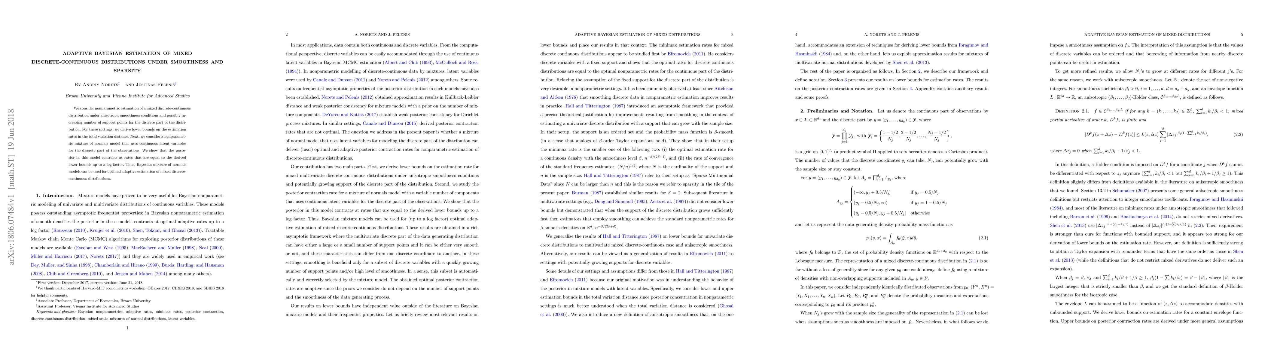 This paper develops adaptive Bayesian estimation methods for mixed discrete-continuous distributions under smoothness and sparsity conditions. It establishes lower bounds for estimation rates and demonstrates that Bayesian mixture of normals models achieve these rates, providing optimal adaptive estimation.