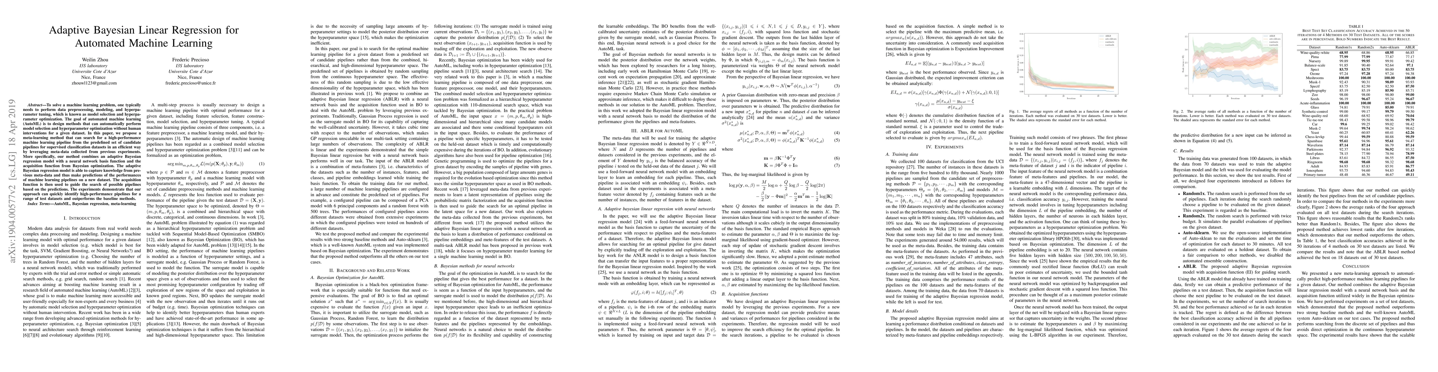 This paper proposes an adaptive Bayesian linear regression method combined with neural networks and Bayesian optimization to efficiently automate model selection and hyperparameter tuning in machine learning. The approach leverages meta-data from previous experiments to predict the performance of machine learning pipelines, quickly identifying high-performing configurations and outperforming baseline methods.
