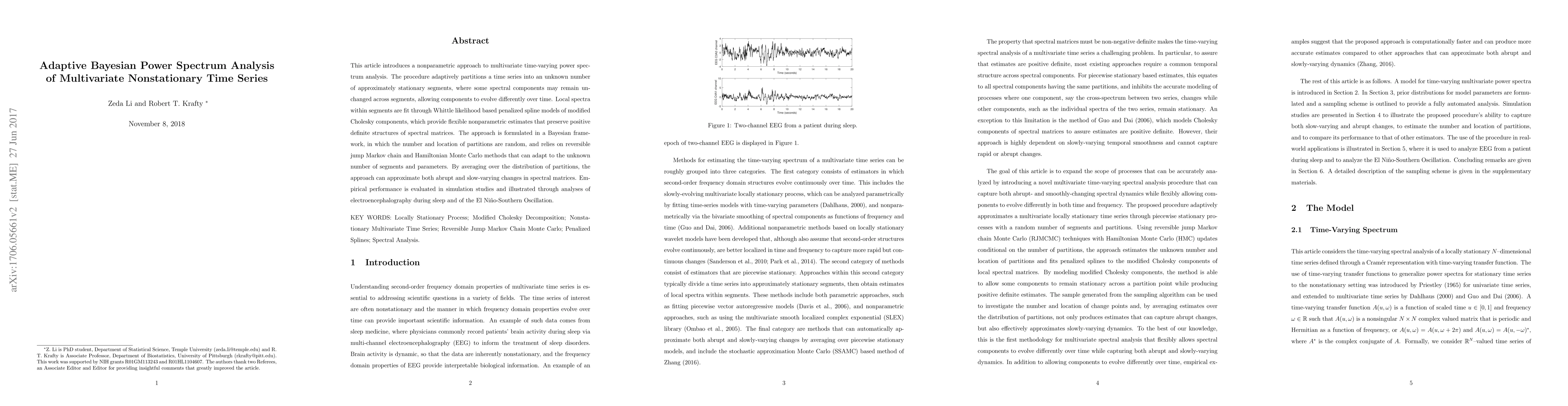 This paper proposes a Bayesian nonparametric method for analyzing multivariate nonstationary time series, adaptively partitioning them into stationary segments with varying spectral components. The method uses Whittle likelihood and penalized spline models to fit local spectra, and employs reversible jump MCMC and Hamiltonian Monte Carlo for adaptive inference.